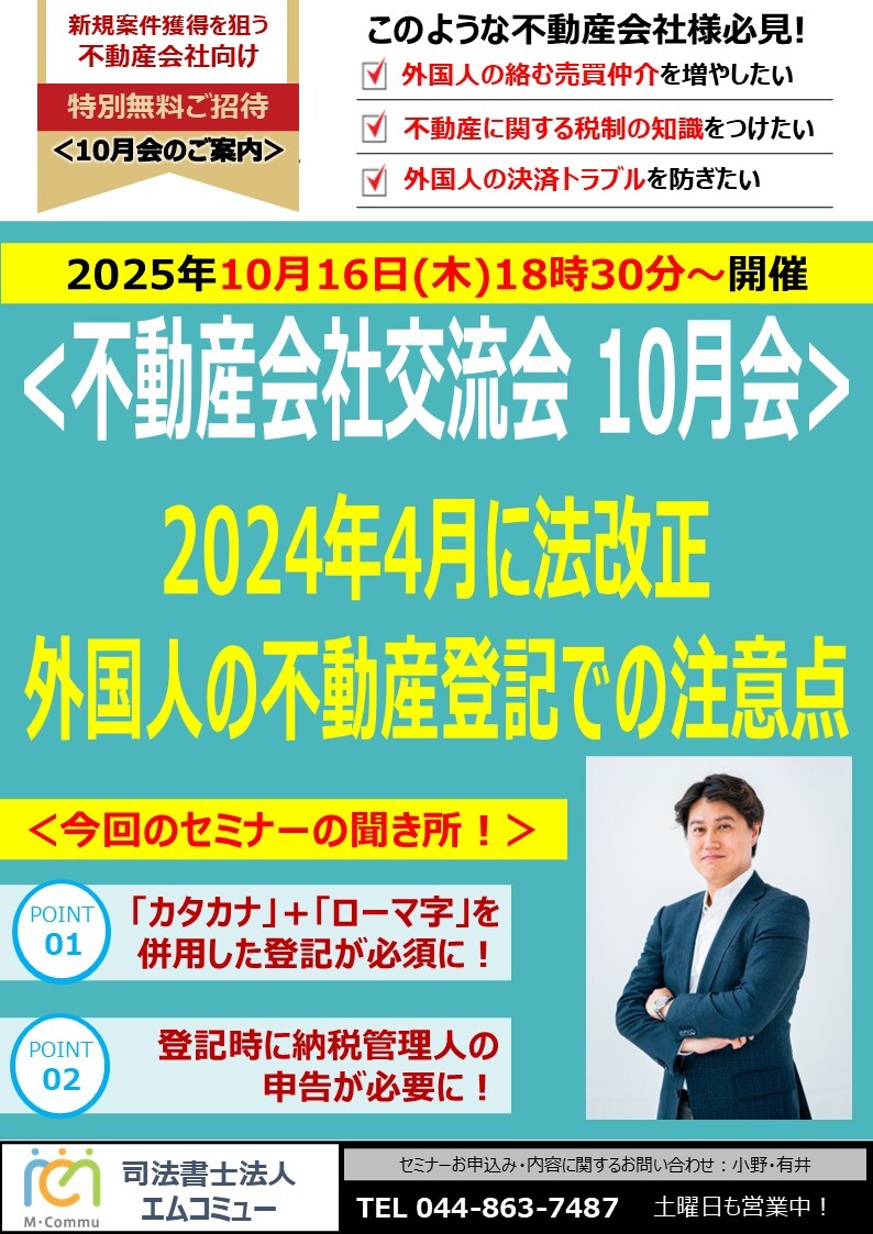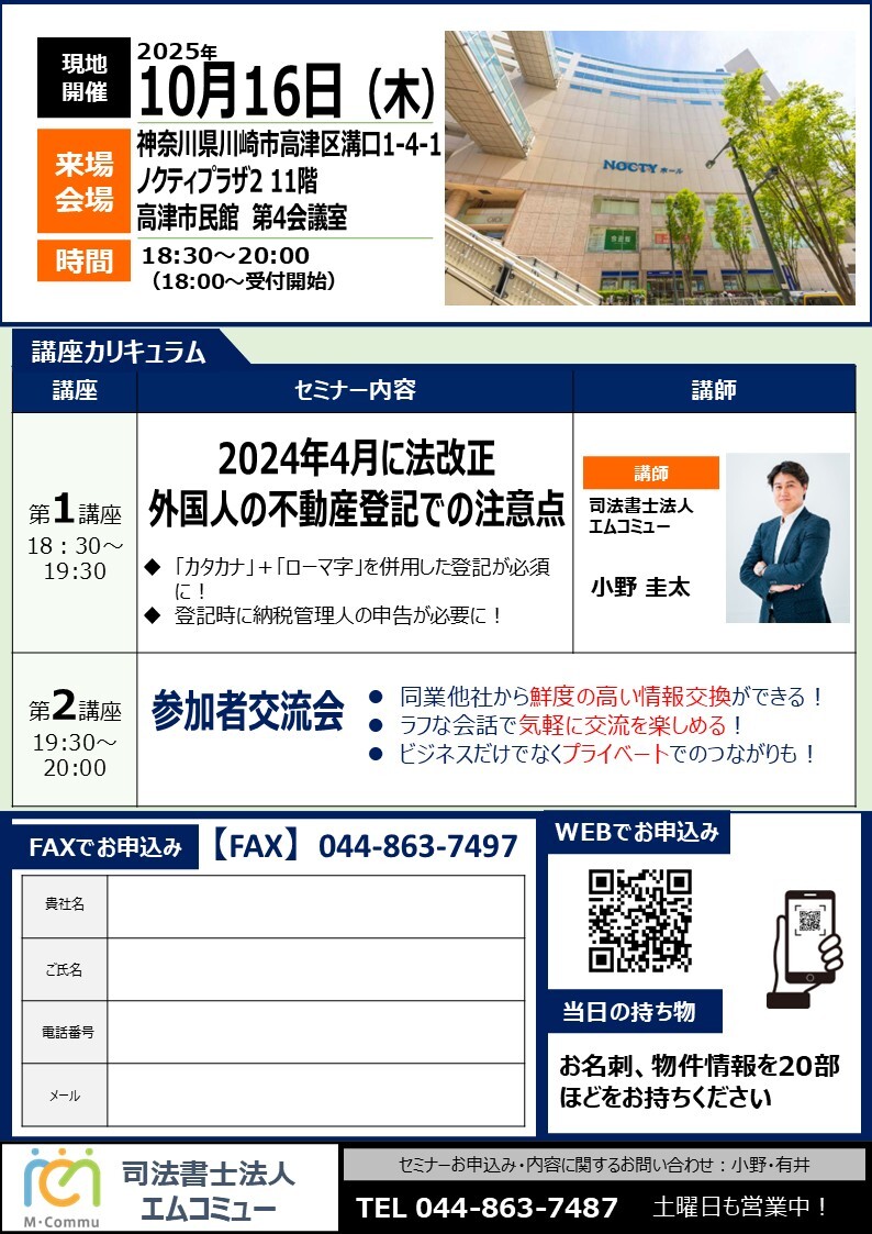 📢【不動産会社向けセミナーのご案内】 2025年10月16日(木)18:30~ ノクティプラザ川崎にて開催! テーマ: 「2024年4月法改正 外国人の不動産登記での注意点」 ☑ カタカナ+ローマ字の併記登記が必須に ☑ 納税管理人の申告が必要に 👉詳細・申込はこちら #不動産 #登記 #外国人対応 pic.x.com/3P6g0Y9vPG