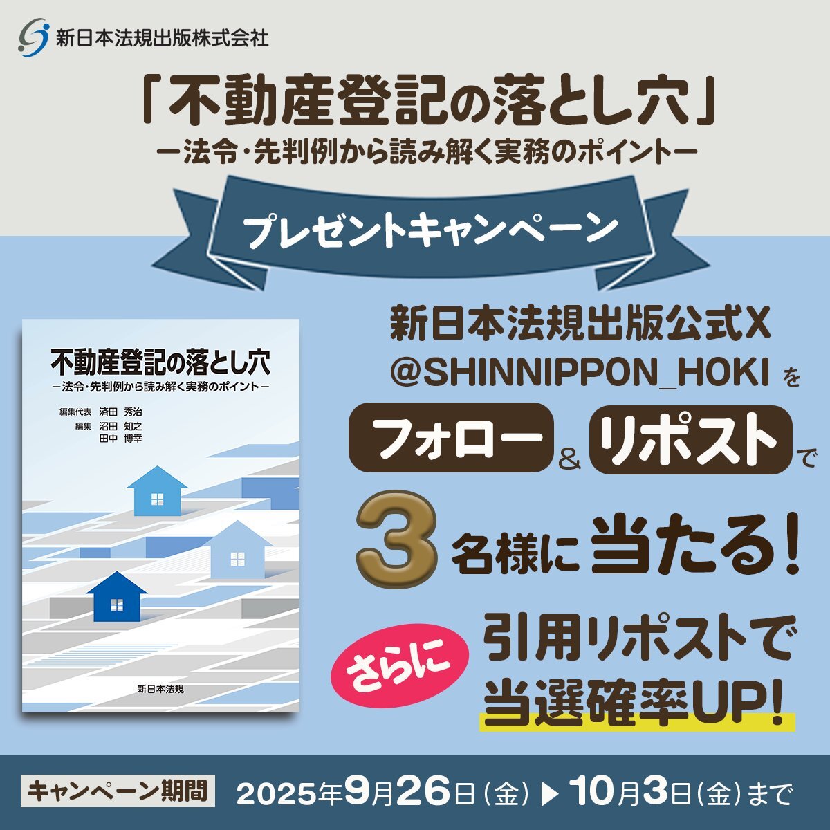 / 📕『不動産登記の落とし穴-法令・先判例から読み解く実務のポイント-』 プレゼント🎁キャンペーン \ 発売を記念して3名様にプレゼント📕 応募方法 ① @SHINNIPPON_HOKIをフォロー ② この投稿をリポスト 🌟引用リポストで当選確率UP! 〆10/3(金)23:59まで 詳細はリプ欄👇️ #司法書士