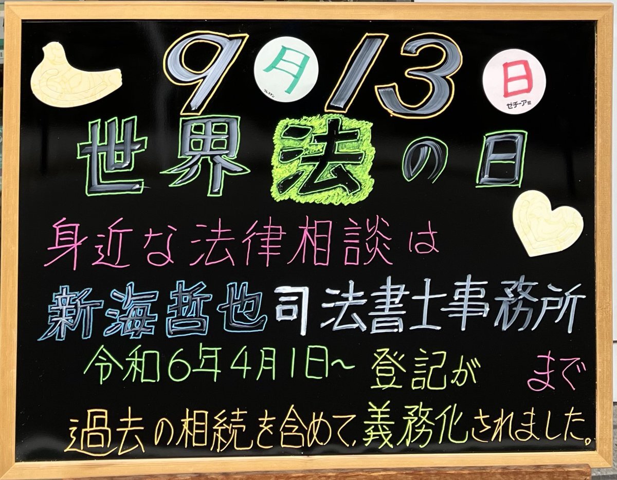9月13日は「世界法の日」📖 🌼身近な法律相談は  ➡️新海哲也司法書士事務所まで 令和6年4月1日から 登記が 過去の相続を含めて、義務化されました❗️ #世界法の日 #法律 #相談 #司法書士 #登記 #相続 pic.x.com/SxSjNhuAOg