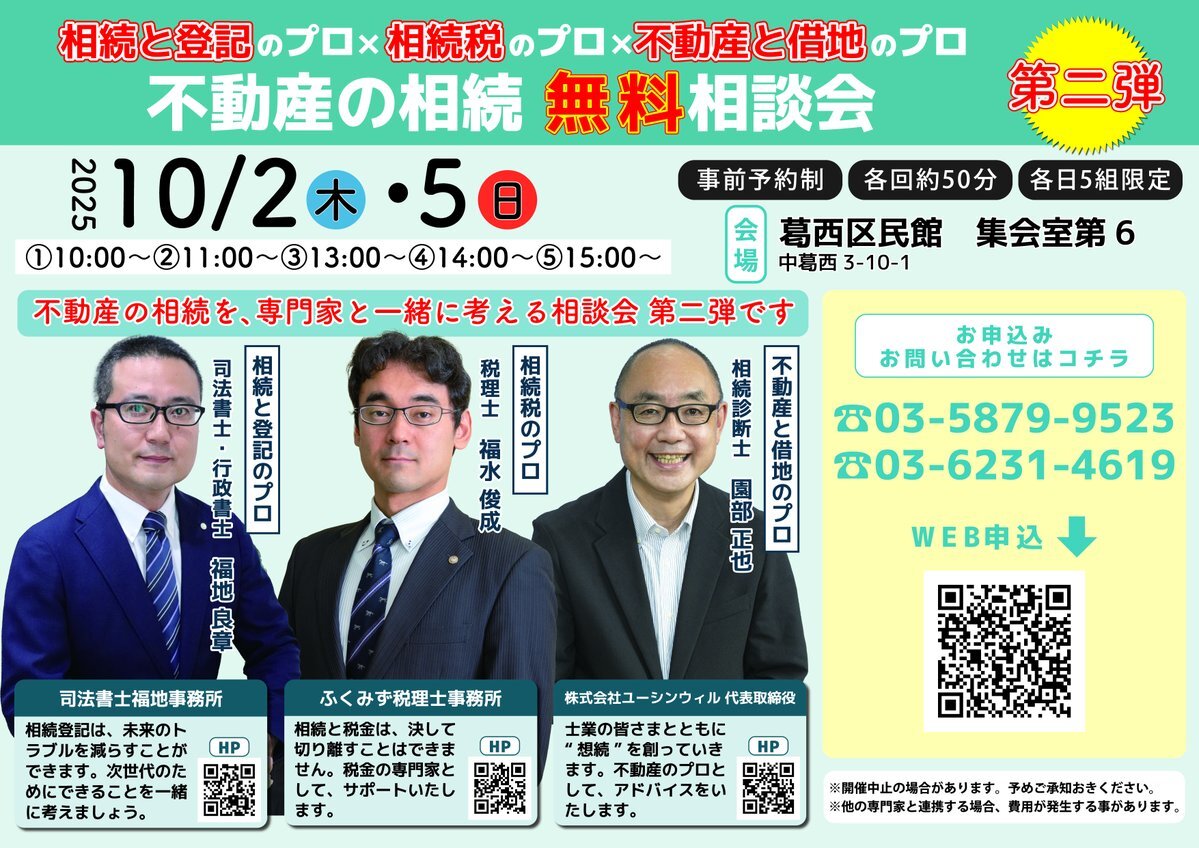 【残りわずか!】 不動産の相続 相談会 司法書士・税理士・相続診断士がタッグを組む無料相談会のご予約、残りわずかです。 登記・税金・不動産のすべてをまとめてご相談ください。 10/2(木)・5(日) お誘い合わせのうえ、お早めに! #借地 #相続 #不動産 #相談会 #葛西 #登記 pic.x.com/R825r0SkqG