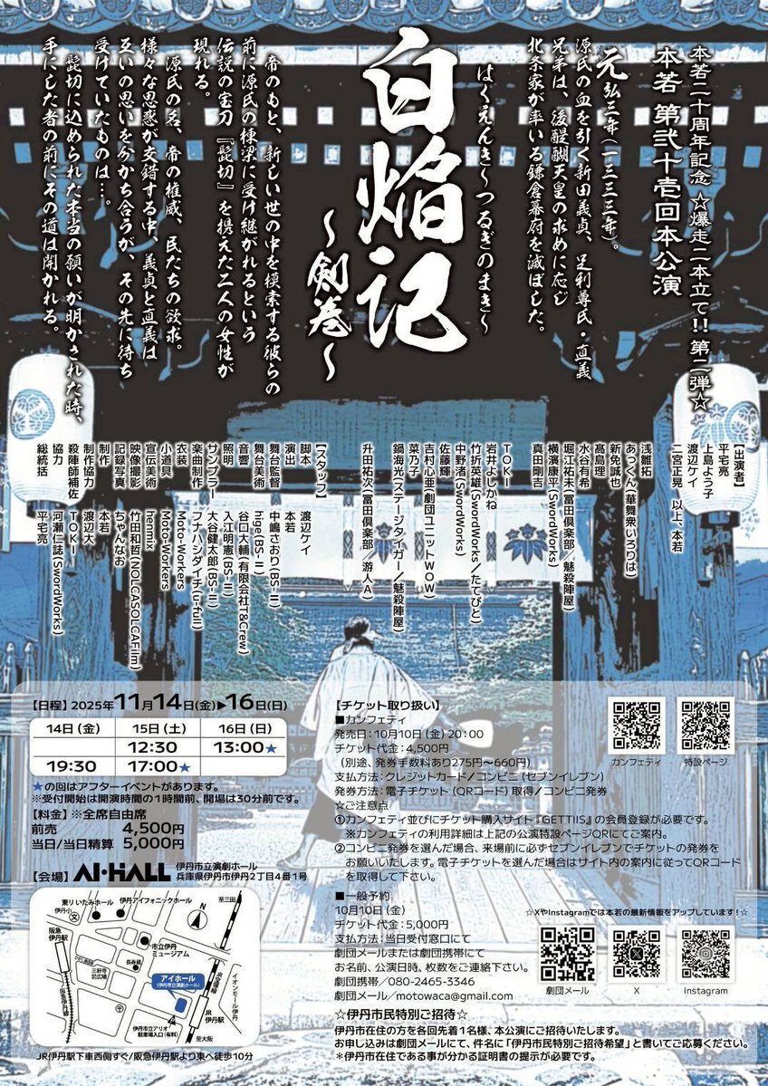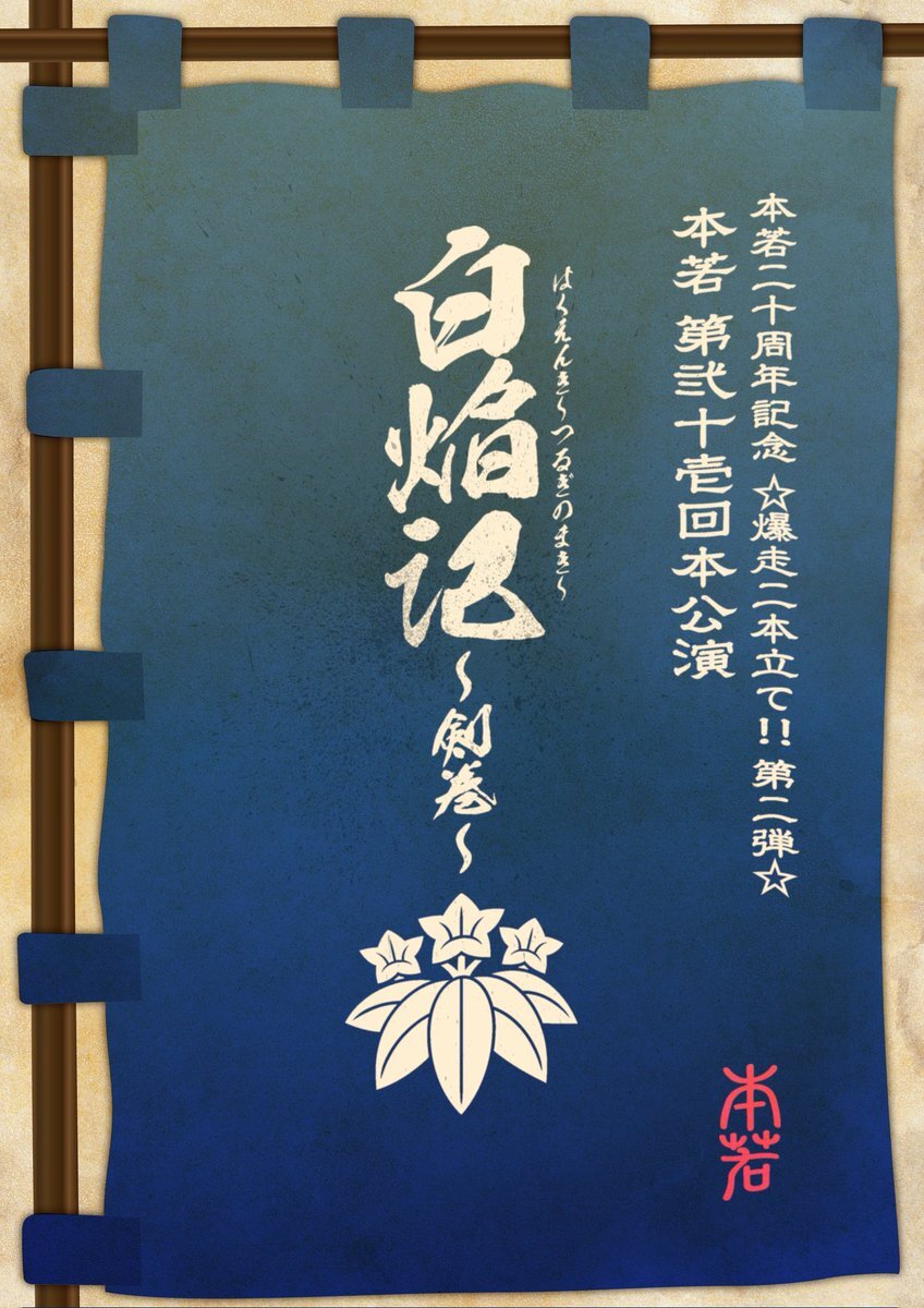 本若二十周年記念 ☆爆走二本立て‼︎第ニ弾☆ 本若第弐十壱回本公演 『白焔記~剣巻~」 会場:アイホール 日時:11月 14日(金)19:30 15日(土)12:30/17:00 16日(日)13:00☆ (☆はアフターイベント) 前売 4500円 当日/当日精算 5000円 10月10日(金)20:00チケット発売 confetti-web.com/@/hakuenki21