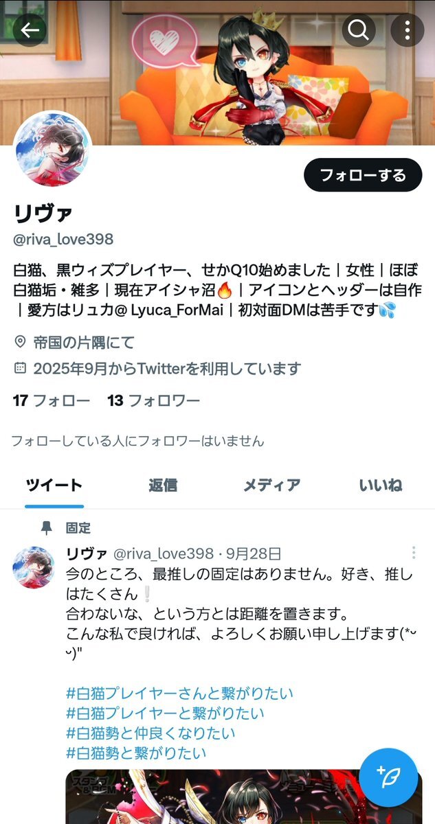 今のところ、最推しの固定はありません。好き、推しはたくさん❕ 合わないな、という方とは距離を置きます。 こんな私で良ければ、よろしくお願い申し上げます(*ᵕ ᵕ)" #白猫プレイヤーさんと繋がりたい #白猫プレイヤーと繋がりたい #白猫勢と仲良くなりたい #白猫勢と繋がりたい pic.x.com/EL39B1ivQw