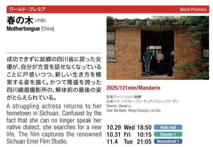 #春の木 期待通り素敵な作品でした!成都を舞台に、帰郷した女優とかつての師匠、その息子のふゎ〜っと進む日常。方言が鍵となる起伏、峨眉撮影所のレトロ感、答えを焦らない作風がとても好き💖 Q&Aの雰囲気が明るくて、映画とご自身の関連などのお話も👍 #春树 #王传君 #刘丹 #白百何 #東京国際映画祭 pic.x.com/zexxr2tgNV