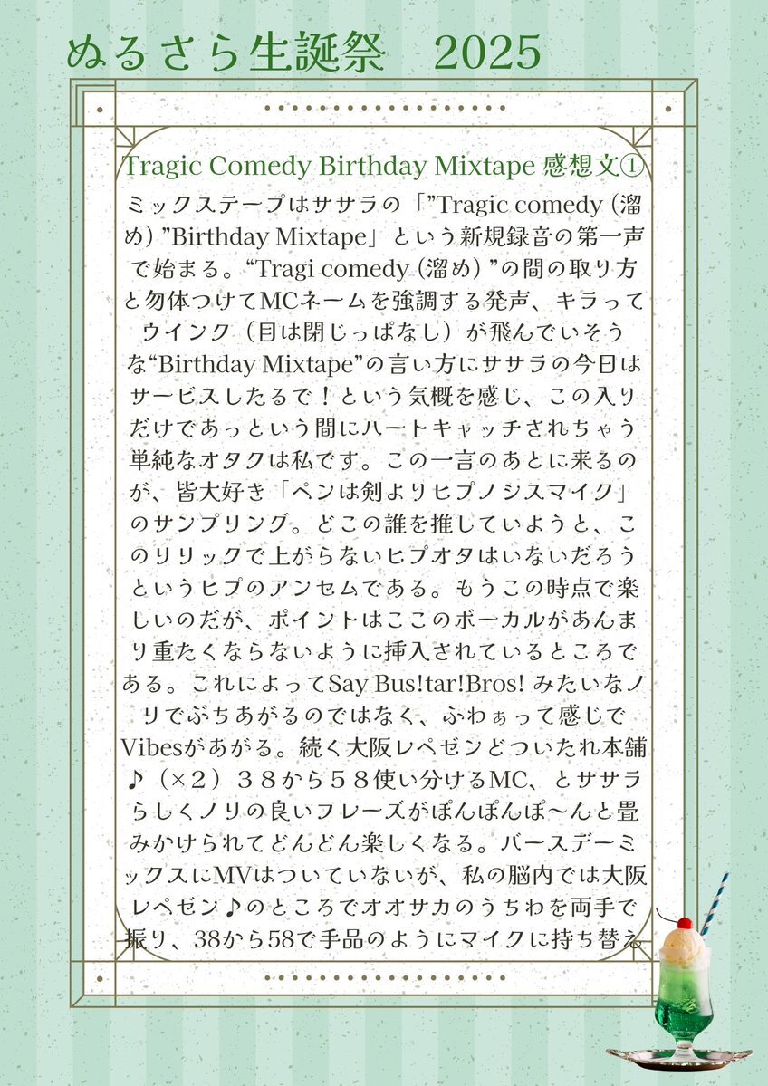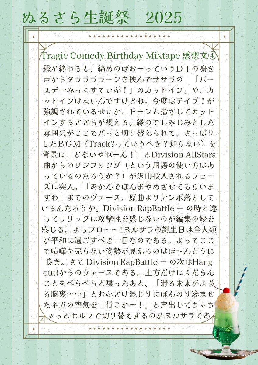 ササラさんお誕生日おめでとう! の気持ちで書いたBirthdaymixtape30分の感想を短く10枚に纏めた怪文書の1枚目から4枚目です。(1/3) 音楽詳しくないオタクです。 遅刻してごめんね。生まれてきてくれてありがとう。 #白膠木簓生誕祭2025 pic.x.com/vBU3EmqR8S