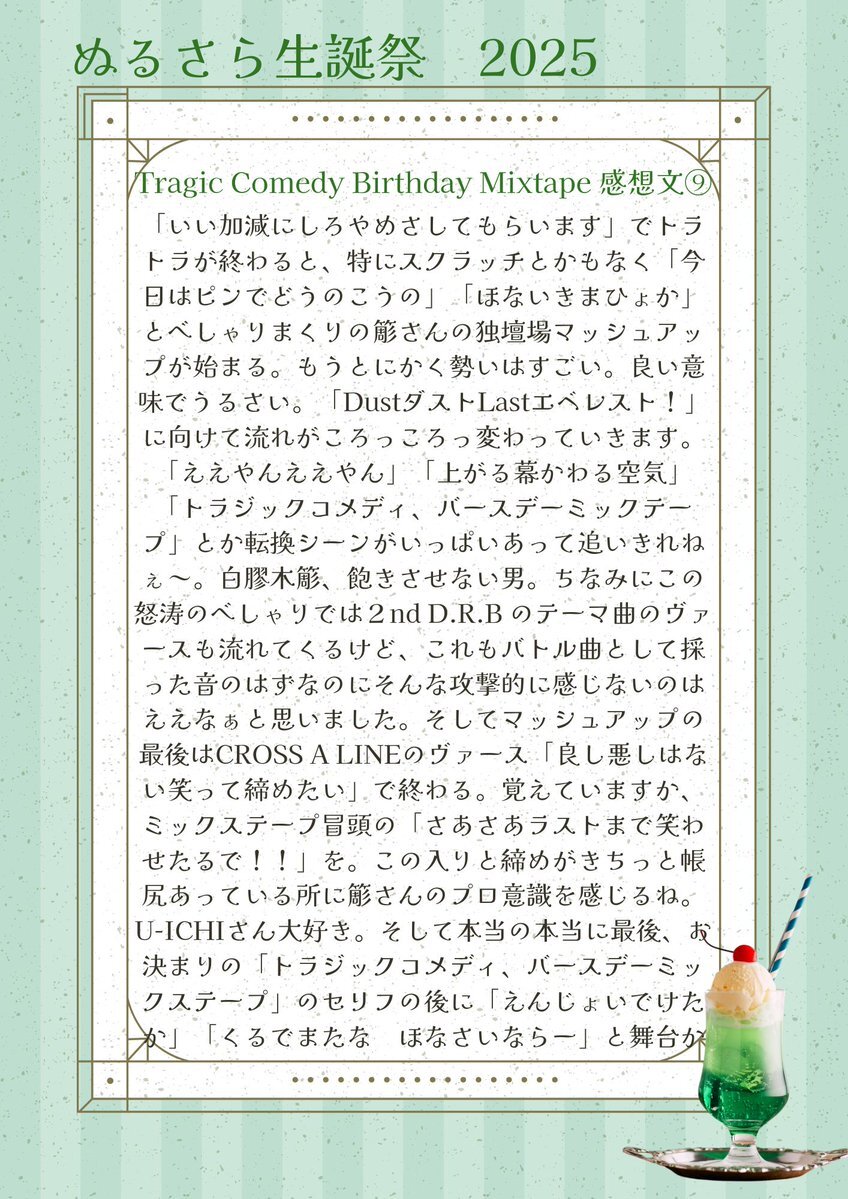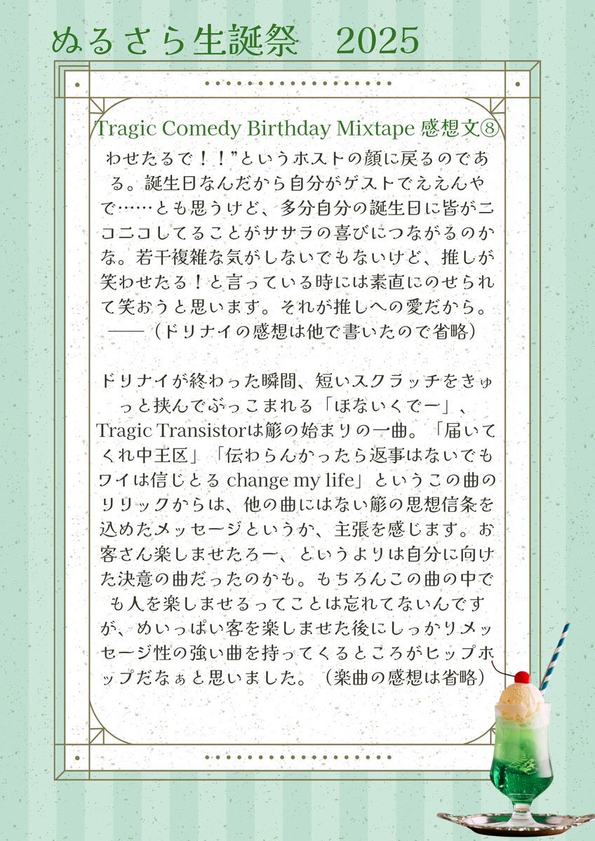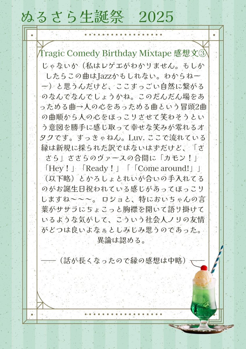 ササラさんお誕生日おめでとう!のBirthdaymixtape感想文(3/3) 8枚目と9枚目です。音楽詳しくないオタクの怪文書です。絵が描けないから文字しかない。 遅刻してごめんね。 #白膠木簓生誕祭2025 pic.x.com/uT6JHO0Pp8