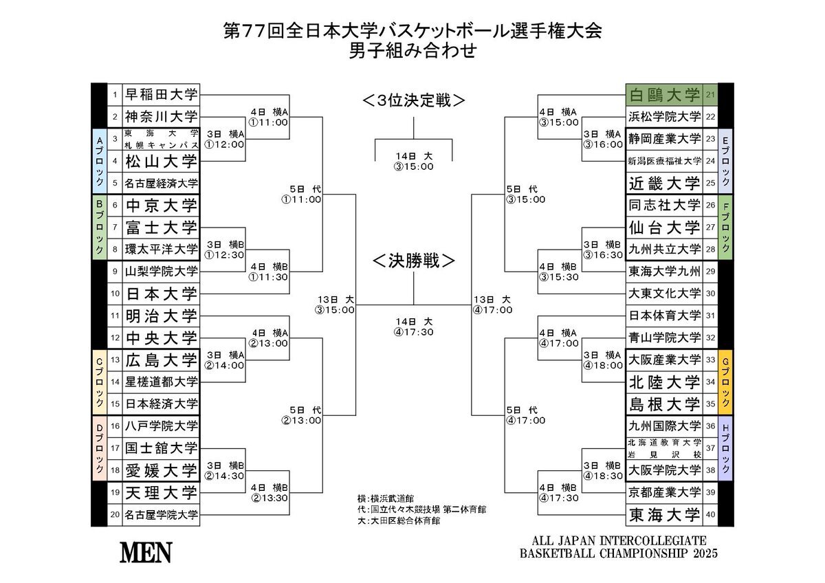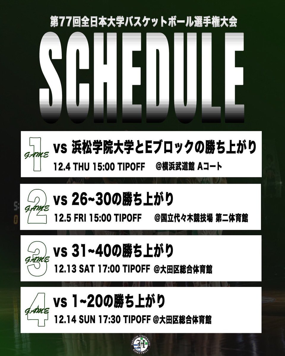 𝐆𝐀𝐌𝐄 𝐈𝐍𝐅𝐎𝐑𝐌𝐀𝐓𝐈𝐎𝐍 第77回全日本大学バスケットボール選手権大会(インカレ)の組み合わせ、競技日程が発表されました! 応援よろしくお願いいたします💚 本学初戦 12月4日(木)15:00 TIPOFF 🆚浜松学院大学とEブロックの勝ち上がり 🏟️横浜武道館Aコート #白鷗大学 #白鴎大学 pic.x.com/cdKREM71g1
