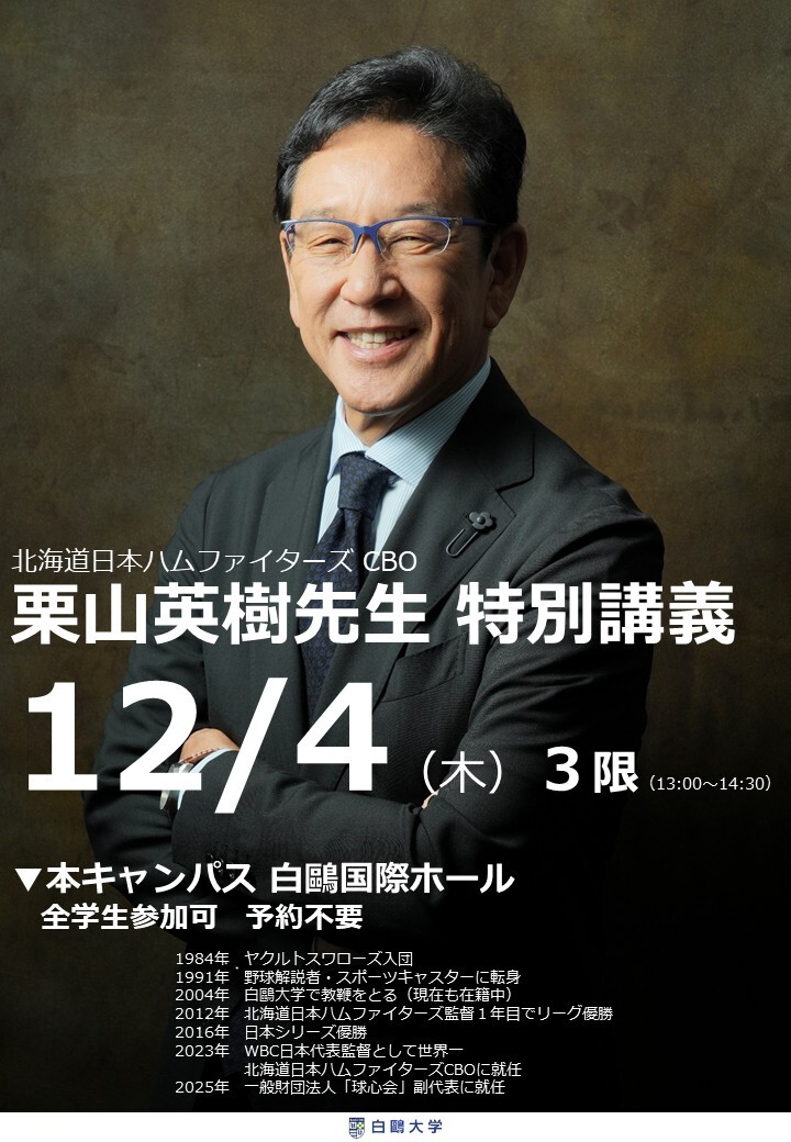 【在学生へ】 大谷翔平選手を「二刀流」として育てた指導者であり、本学教授でもある栗山英樹先生の特別講義を開催します。本学生は誰でも受講可能。ぜひお越しください! 12/4(木)3限 ▼本キャンパス 白鴎国際ホール #白鷗大学 #白鴎大学 pic.x.com/Ld5bQqLng8