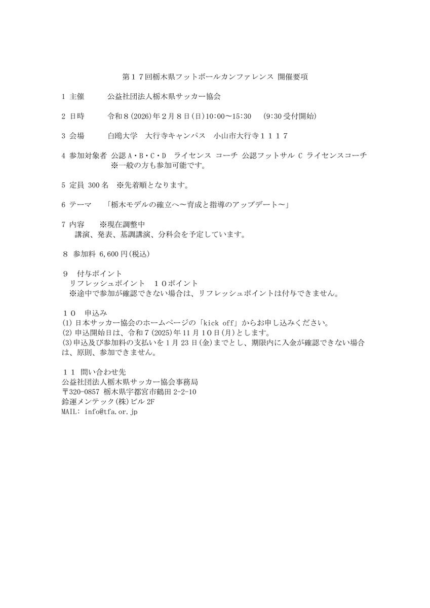 第17回栃木県フットボールカンファレンスの開催について、HPに掲載しました。 tfa.or.jp/wptfa/?p=5193 #栃木県サッカー協会 #tochigifa #tfa #サッカー #指導者 #フットボールカンファレンス #リフレッシュ講習会 #白鴎大学 pic.x.com/tkyrQErkEj