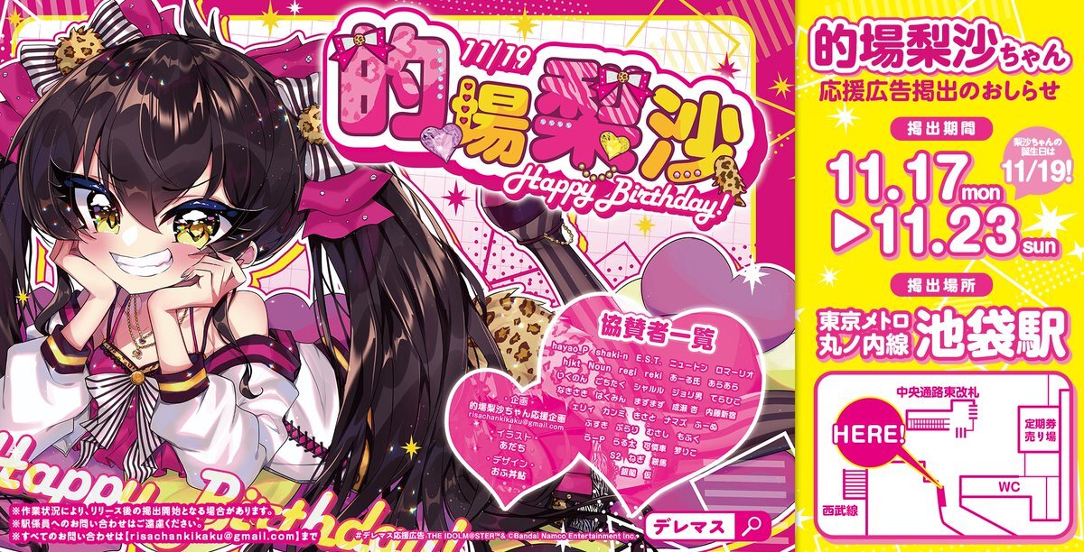 🎉🐯応援広告掲出のお知らせ🐯🎉 的場梨沙ちゃんのお誕生日を記念して、 応援広告を掲出いたします!✨ 📅掲出期間:11/17(日)〜11/23(土) 📍掲出場所:東京メトロ 丸ノ内線 池袋駅 詳細は画像をご覧ください👀💖 #デレマス応援広告