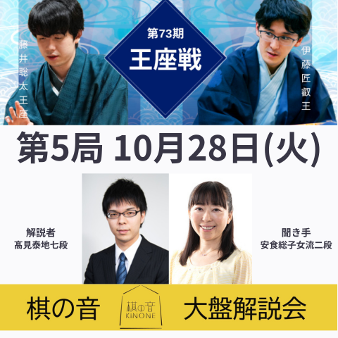 【将棋会館 棋の音道場】 王座戦第5局大盤解説会開催! 10月28日(火) 解説者:高見泰地 七段 聞き手:安食総子 女流二段 17:00 受付開始 17:30 大盤解説会 開始 終局まで(予定) 🌟注目の最終局!! お申込みは下記URLから store.shogi.or.jp/view/item/0000… 皆様のご参加をお待ちしてます😊
