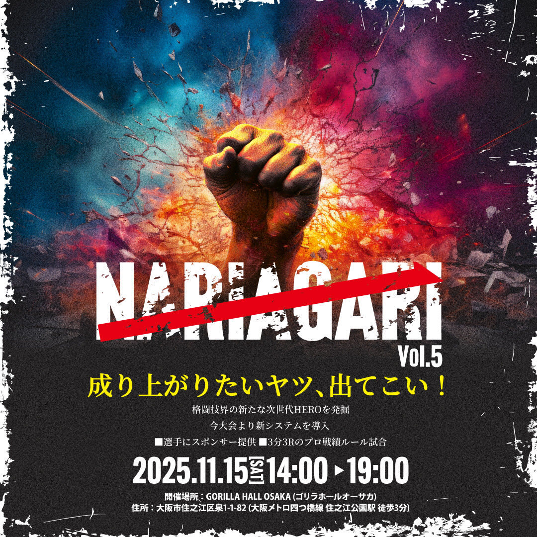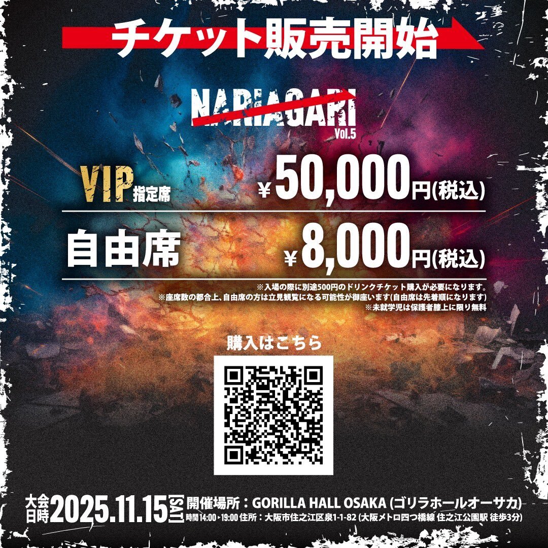🎟前売りチケット完売御礼🙇♀️ 一般観覧チケット、VIP席・自由席ともに完売いたしました。たくさんのご購入、そしてお問い合わせいただき、誠にありがとうございます。 ※当日券について若干数ではございますが販売予定 ▶️前日公開計量を皇治チャンネルにて配信! #nariagari @1_kouzi @1_TEAMONE