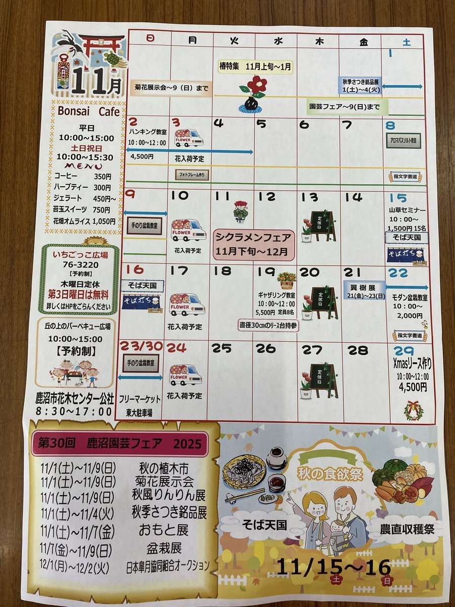 だんだん寒くなって来ましたね💦11月もよろしくお願いいたします😊#鹿沼市花木センター #イベントカレンダー #鹿沼園芸フェア #秋季さつき銘品展 #菊花展 #おもと展 #花展 #盆栽展 #秋風りんりん展 #ワークショップ受付中 pic.x.com/M6UUXwoS0a