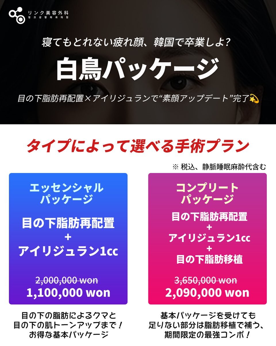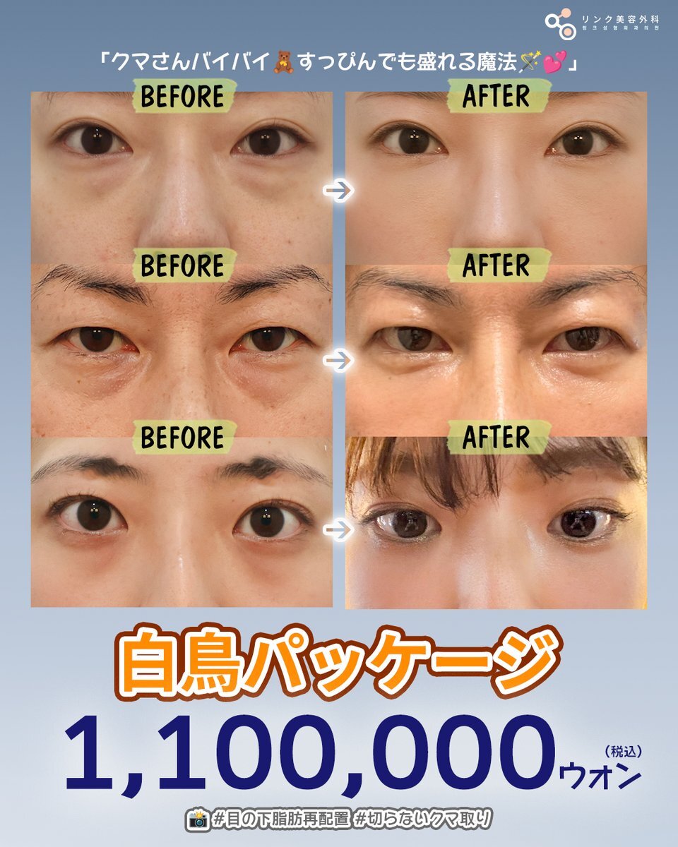 クマ取りの最終兵器! 予算とクマのタイプで選べる神プライス✨ 韓国・リンク美容外科の白鳥パッケージで目の下のクマを根本解決し、アイリジュランで肌のハリ・潤いを同時ケア! メイクのりも良くなること間違いなし💪 #クマ取り #目の下のクマ #裏ハムラ法 #ビフォーアフター #韓国美容 #若返り pic.x.com/VjyGf7Vkwx x.com/kankokuseikei_…