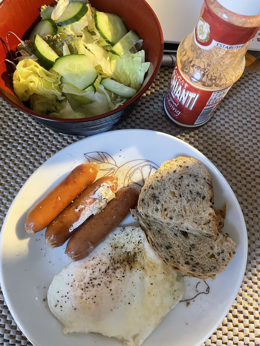 2025.11.16(日)朝食 サラダ 目玉焼き ソーセージ3本 ブールパン キャンティドレッシング #料理記録 #朝食 #サラダ #目玉焼き #ソーセージ3本 #ブールパン #キャンティドレッシング pic.x.com/nQSy5MzMsd
