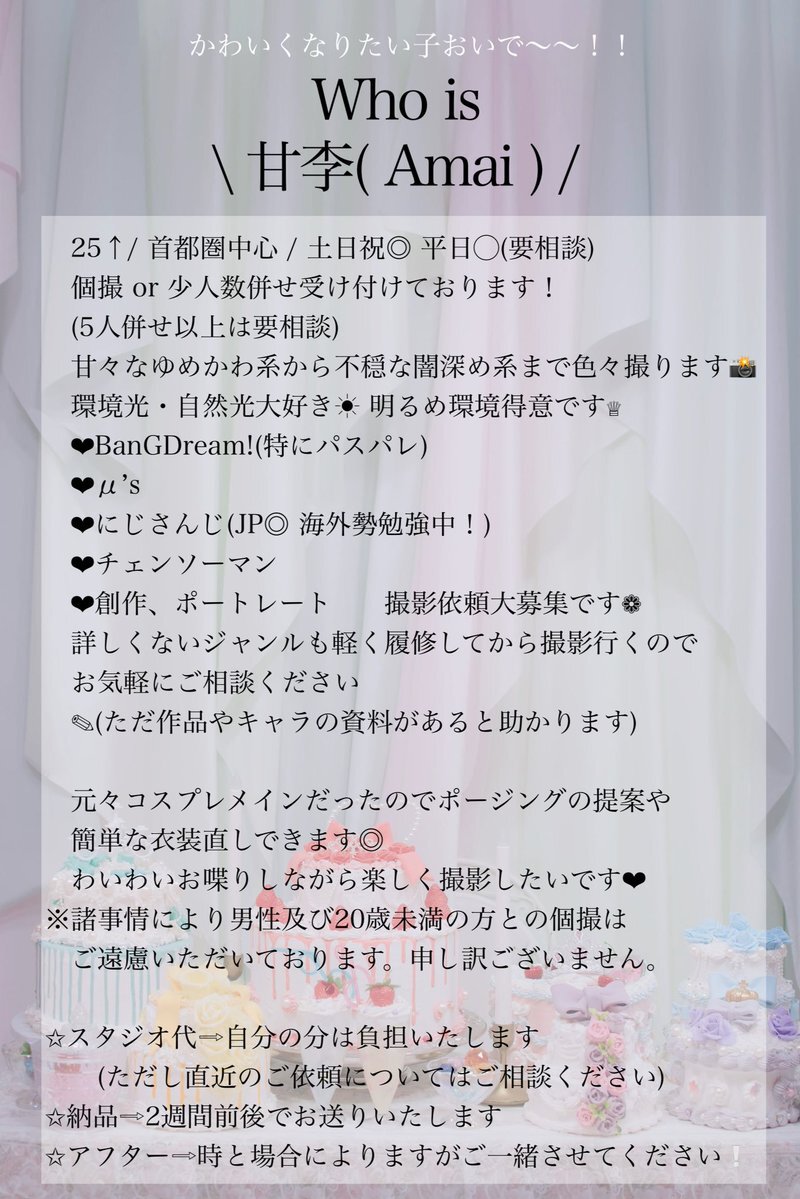 ____ 自己紹介が長いので1枚目にまとめました📝20代社会人カメコです🚺 26年1月以降の予定募集しています!! なかなかイベント行けない分たくさんの方と撮影に行きたいです♡ よろしくお願いいたします❕ ※写真ご協力ありがとうございました! #相互さんの相互さんと繋がりたい pic.x.com/YMTkCXPbWc