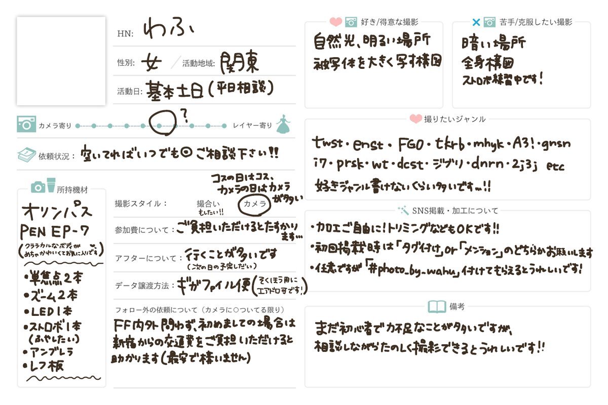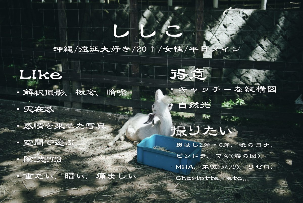 関東で基本土日祝活動。 暗めの撮影が得意で、男装から血糊などの特殊撮影やフェチ系まで広めです!写真集やROM、サブスク系の投稿用撮影のお手伝いもしてます。 ご縁がありますように…! cos.guide/i/Sheryl_Noooo… #コスプレイヤーさんと繋がりたい #相互さんの相互さんと繋がりたい