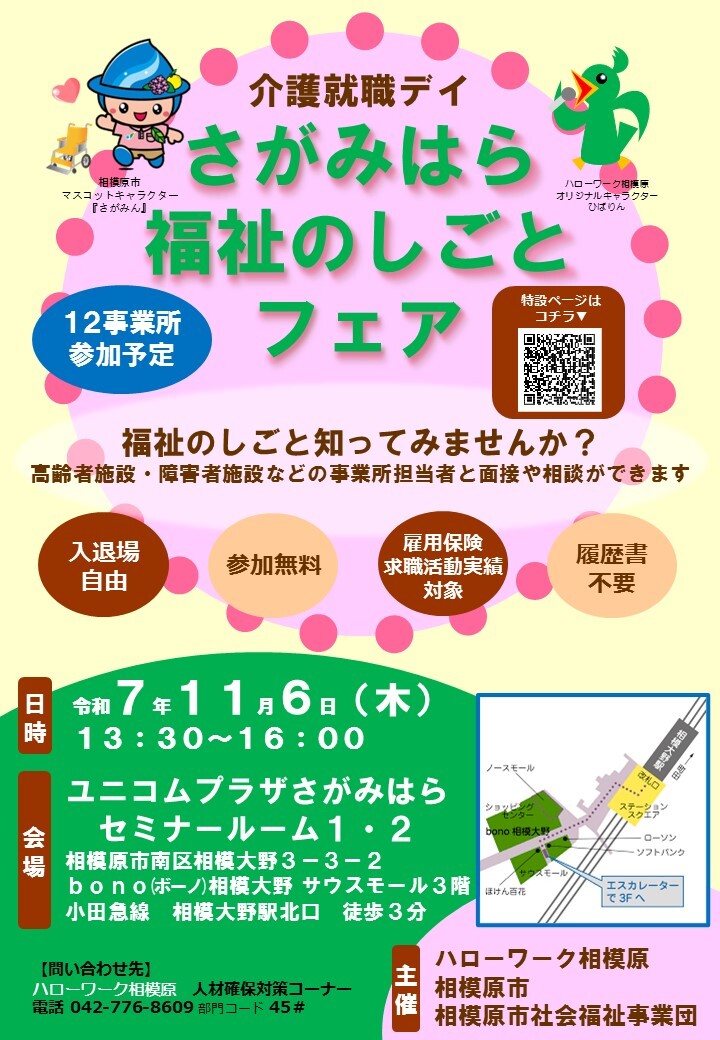 さがみはら福祉のしごとフェア、いよいよ来週開催! 詳細は添付チラシをご覧ください! 福祉の仕事を知ってみませんか?説明だけでもOK!当日面接OK! jsite.mhlw.go.jp/kanagawa-hello… #相模原市役所 #人材確保対策コーナー #ハロワ #福祉の仕事 pic.x.com/wozhOvUFlc