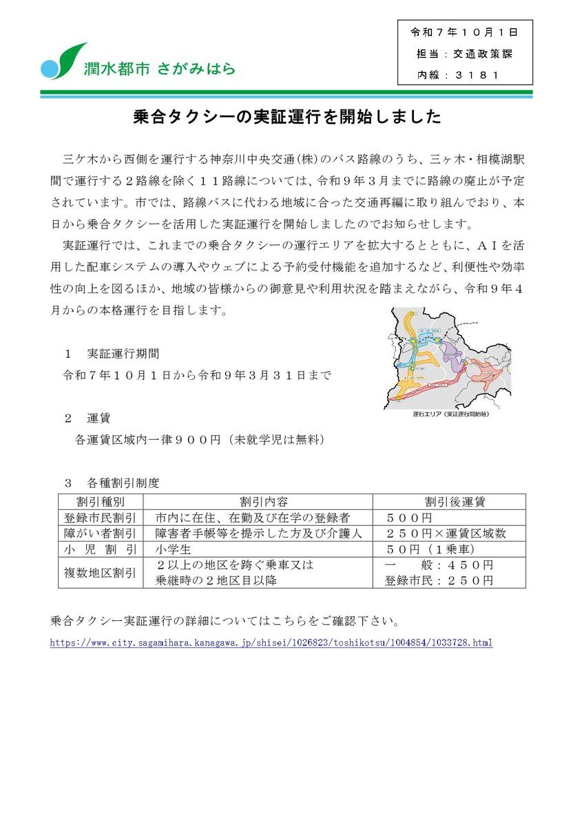 廃止が予定されている路線バスに代わる新たな交通手段として、導入が検討されている乗合タクシー。 本日10/1より実証運行が開始されます。 地域の足としてより良い公共交通にしていくために、ぜひご利用いただき、ご意見を市にお寄せ下さい。 #相模原市緑区 #相模原市議会議員 #相模原市議会 pic.x.com/lRoMqzmRjP