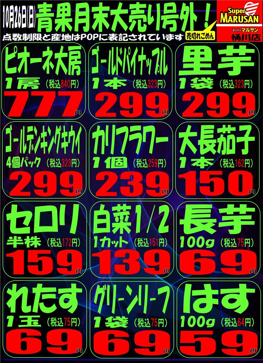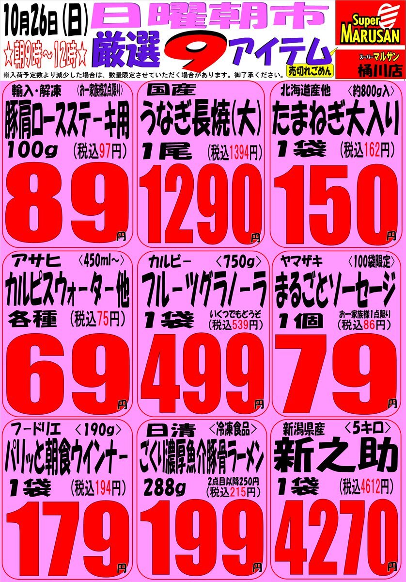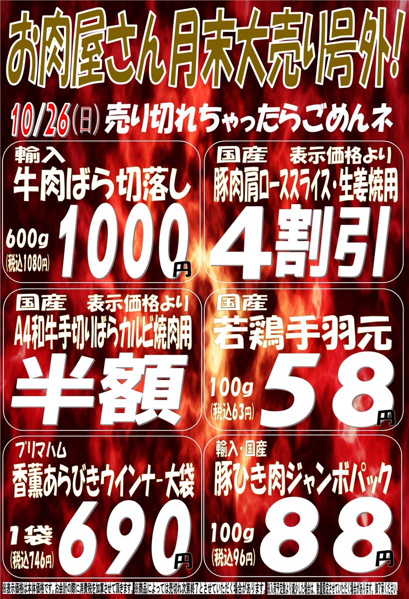 #日曜朝市 #県内最安値 #3時のタイムサービス #牛乳特売日 10.26(日)早朝タイムサービス「日曜朝市」とチラシに載せきれなかったお買い得品号外のご案内です!(#^^#) pic.x.com/WjA63FivKR