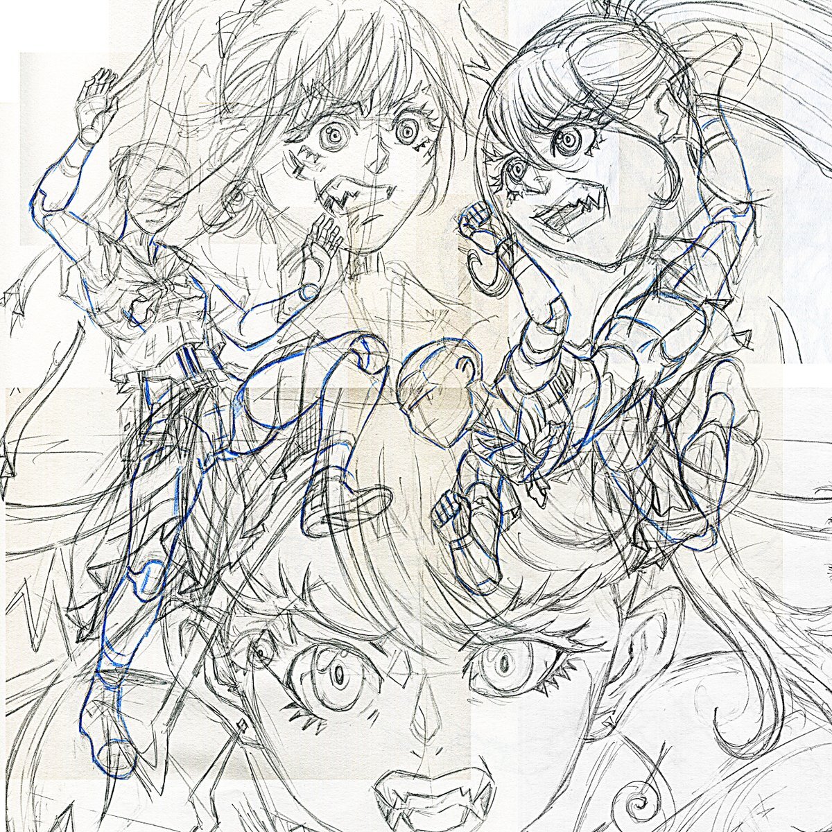 [制作過程と素材:MAKING&MATERIAL]風神雷神図W(DOUBLE) 1/3[スケッチと構図]これまでつくられてきた風神雷神図を参考にしながらスケッチを重ねる。構図は最初、舞台の路地裏の建物の高低差を活かした構図も検討するも、しっくりこず(あまり活かせず)、横構図に変更。 #和歌山県展 #県展。 pic.x.com/UIgPhB16qP