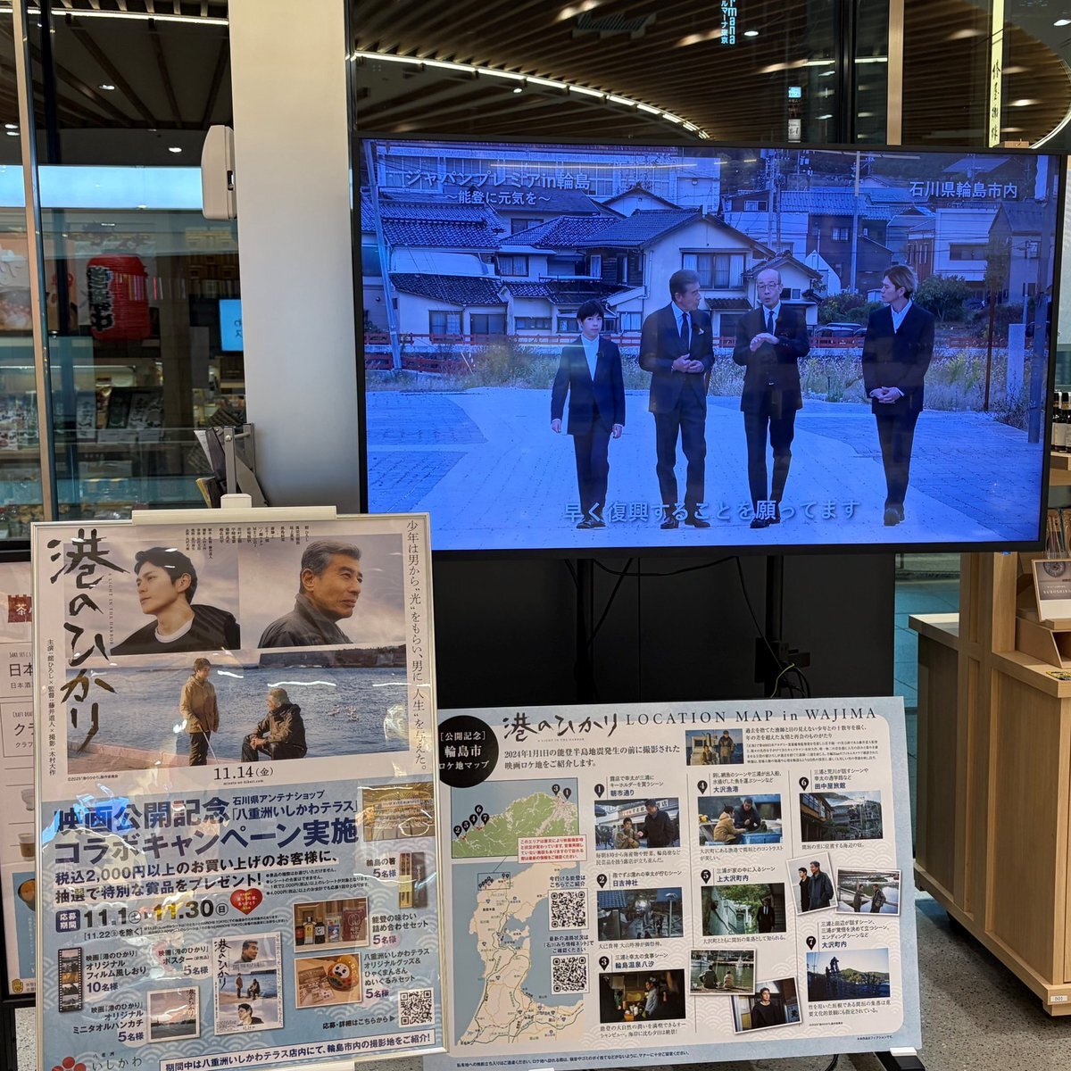 いよいよ本日11/14(金)公開 八重洲いしかわテラスでは、映画「港のひかり」とのコラボ企画開催中🎥 本作品は2024年1月の地震前、輪島市で撮影されました。 店内では輪島を訪れたキャストの皆様の特別映像も放映中! 輪島市への思いあふれるコメントは必見です 詳細はこちら:ishikawa-antenna.jp/event/detail/0… x.com/ishikawaantenn…