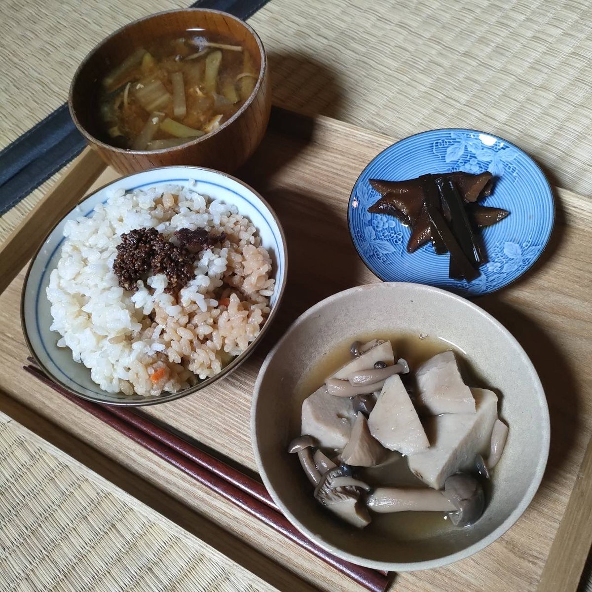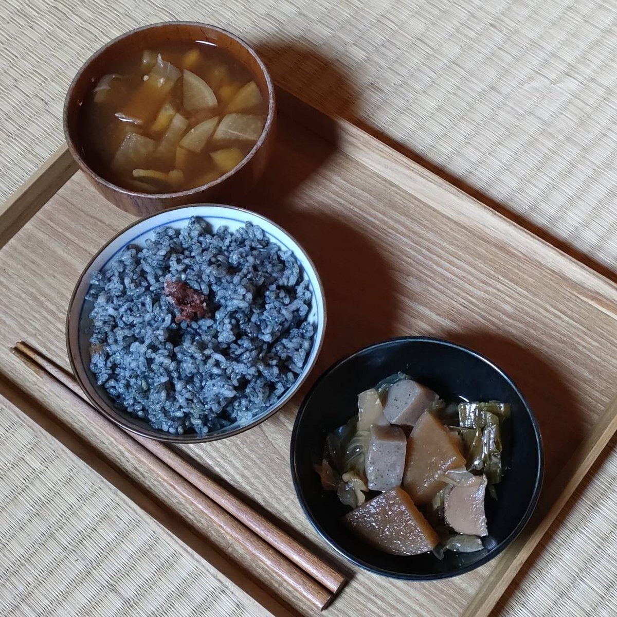 昼ごはんです🥰   ・野菜の味噌汁 ・こんにゃくと大根の煮物 ・竹炭ご飯と梅干し   #大日月地神示 #真の暮らし #ひふみの食べ方 #昼ごはん #竹炭 #感謝して #いただきます pic.x.com/CPXR4GUv51