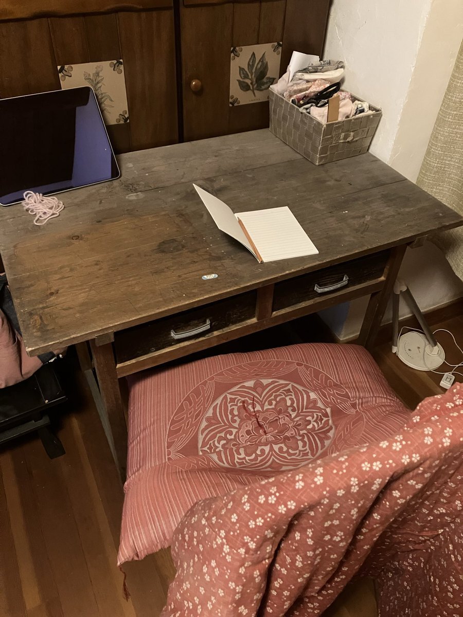 部屋の隅っこに 書斎スペース勝手に設置😁   机は、改修する予定の古民家にあった机。 焼け感と使い古したレトロ感が とても良い感じです😋   ミシン台だったのかな…?(写真2枚目)   #真の暮らし #古道具 #古民家 #レトロ #書斎 #ミシン台 pic.x.com/gFNTLjUjGI