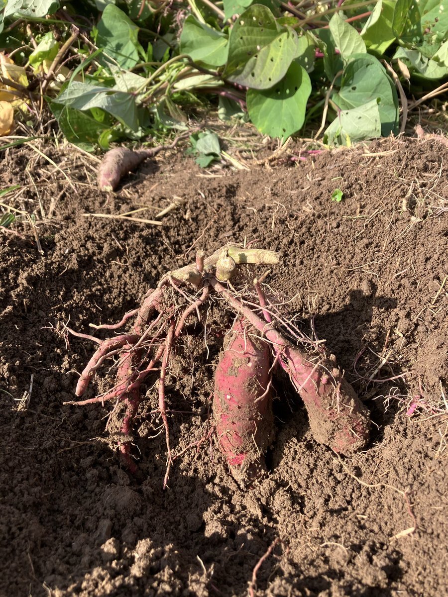 お芋収穫中〜   まだまだあるよ🍠    今日もいい天気で暑いくらい🫠   うちの芋掘りは、 宝探し並みの芋掘りです😆   #真の暮らし #芋掘り #畑仕事 pic.x.com/q0grQ9ehkH