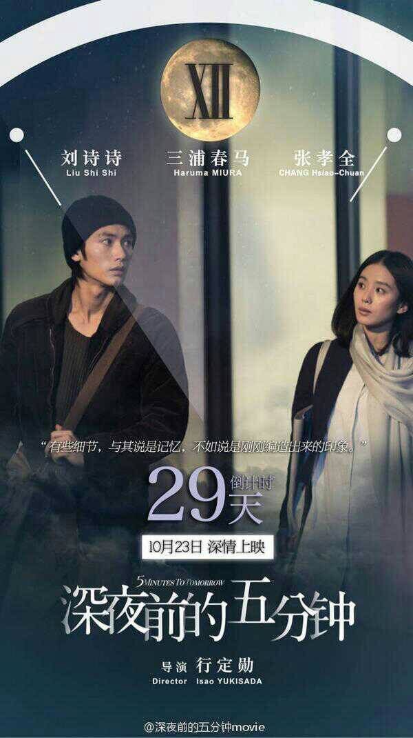 この中国のカウントダウンポスター、初めて見たけどデザインセンスが個人的に物凄く好きだ。 バックの店の黒い柱?のようなものを時計の長針に見立てて、良とルオランをそれぞれ0時5分前と5分後に配置してる。 まるで、2人を繋げたあの金時計の中にいるみたい。 #真夜中の五分前 #三浦春馬 pic.x.com/VlSpikKplk