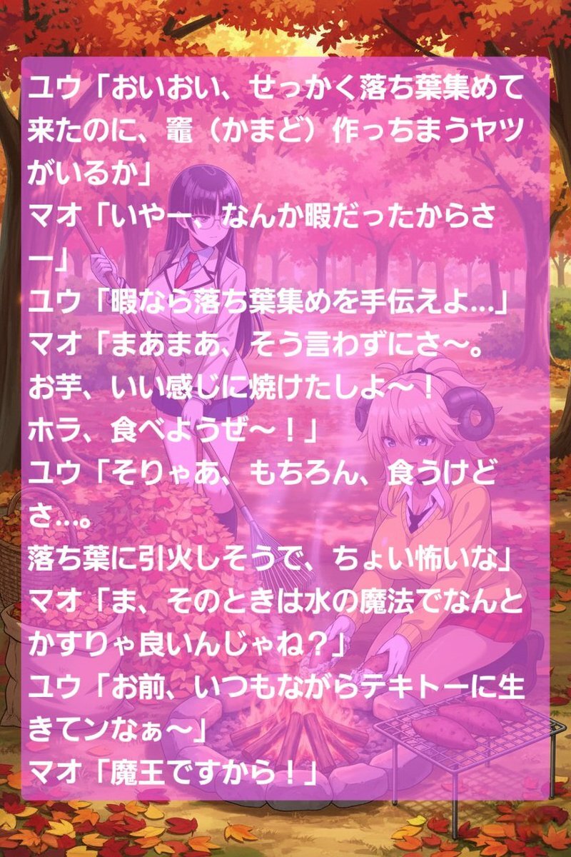 おはようございます☀ って、今朝メッチャ寒いですな!Σ(゚Д゚) 雨はガンガン降ってるし! 何すか、この気温の低さはー!? 皆さん、風邪など引きませぬように💦 さて、本日は #真央ちゃんシリーズの日常 #フリー台本 を公開しましたよ! 秋っぽく焼き芋の話ですが、ワタシはまだ食べてないんですよ〜 pic.x.com/TqikOXEajZ