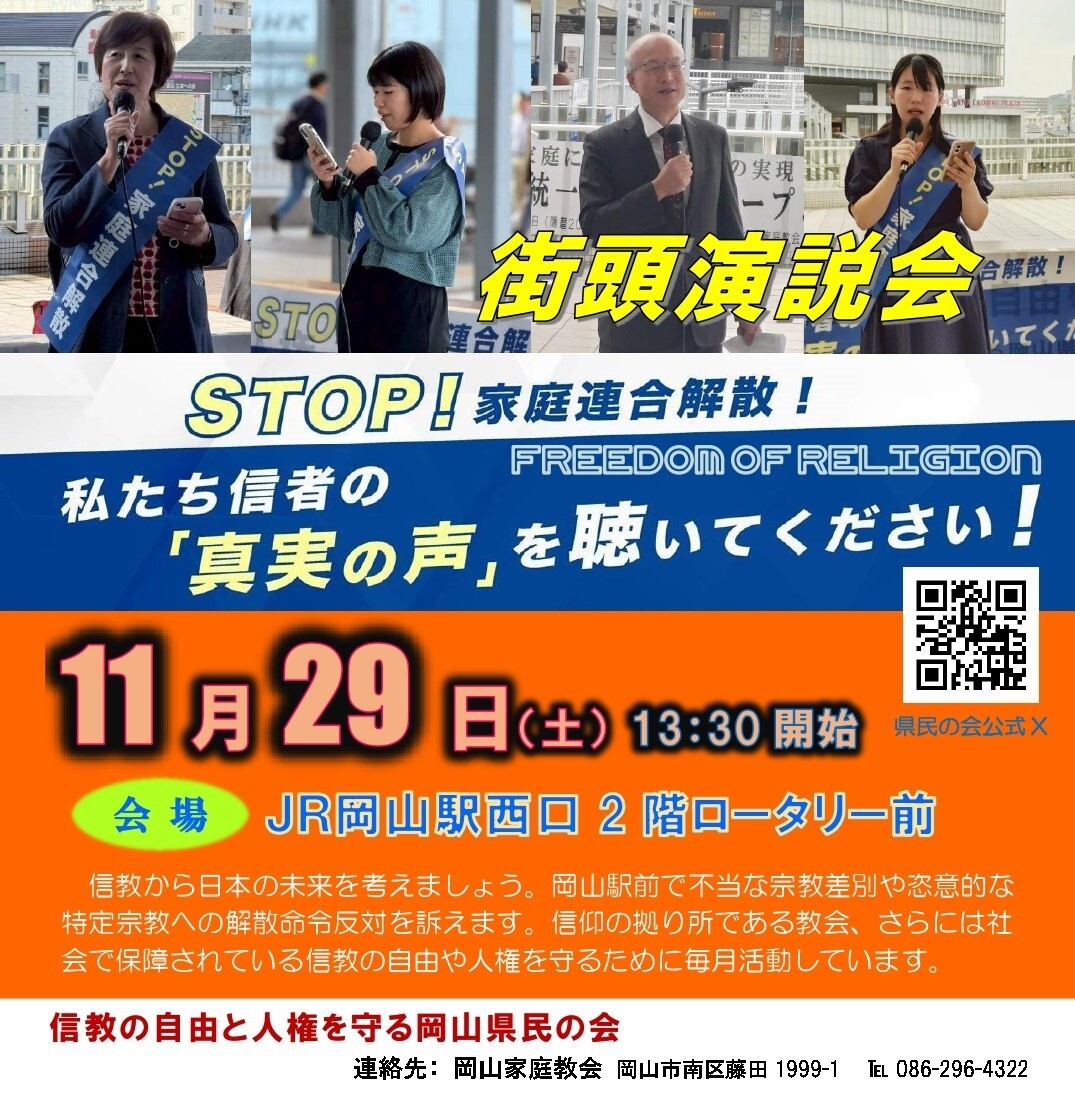 本当に信教の自由が脅かされてる? 岡山駅で聞けるチャンス! 11/29 13:30から、 みんなの声が聞きたい人集合! #宗教の自由 #統一教会 #真実の声 #岡山 x.com/okym_sinkyo/st…