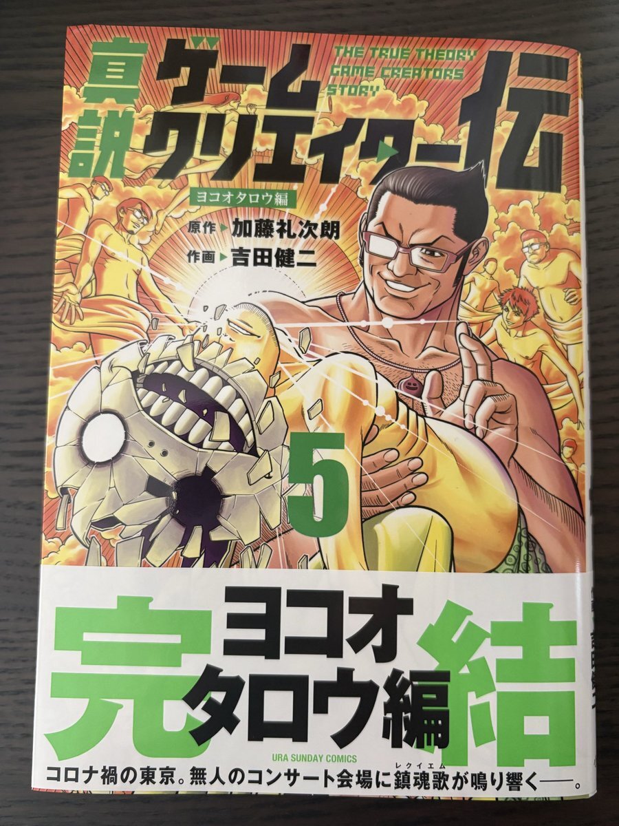 ヨコオが作ってないけど、出演はしている「真説ゲームクリエイター伝」5巻をいただきました! ヨコオ編はこれにて終了です。加藤先生、吉田先生、おつかれさまでした! ※表紙が完全に齊藤さん主人公です。あと、後ろに知り合いが飛んでます。裸で。