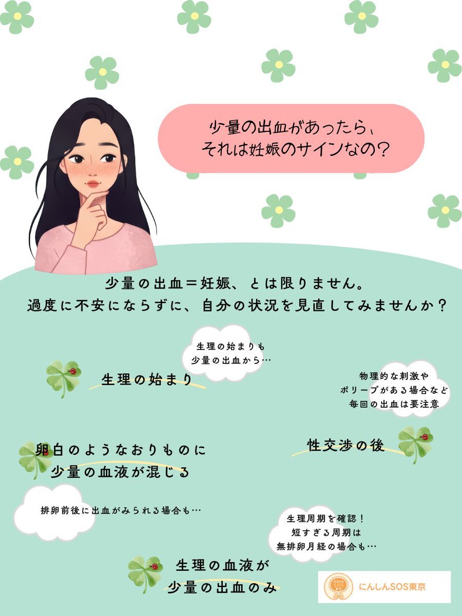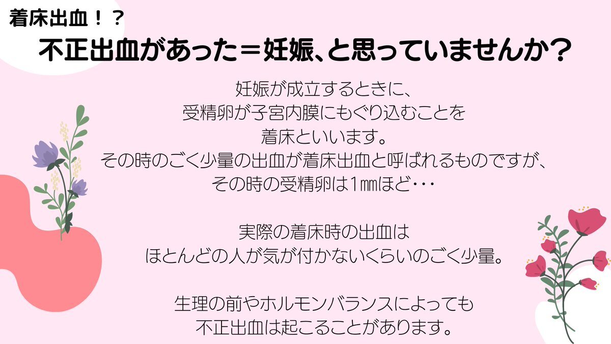 この出血、 #着床出血 かもと悩んだら…💭 身体の中で着床が起こる時の受精卵はとても小さいのが実際です。 生理付近に出血があったとしても、別の理由の方が多いかも。 🍀生理の始まり 🍀妊娠と関係のない不正出血 🍀排卵の時に出血に気づくことも 着床出血かもしれないという悩みも相談できます。 pic.x.com/NEgAsAvApp
