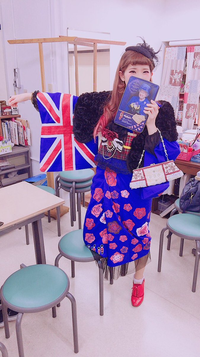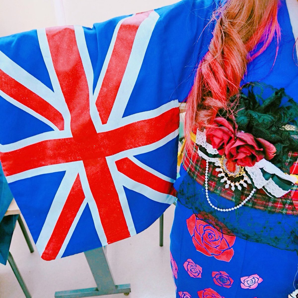 洋服生地で着物を作って、デザインしたものを型染めしてコーディネートしました💂💕1から手作りのオリジナル着物完成✨ テーマは「イギリス🇬🇧」 袖の大きな国旗がお気に入り(簡単そうで染めるの大変だった) #着物コーディネート #今日の着物 #着物自画撮り部 #着物 #イギリス pic.x.com/Fhbk33uWYI