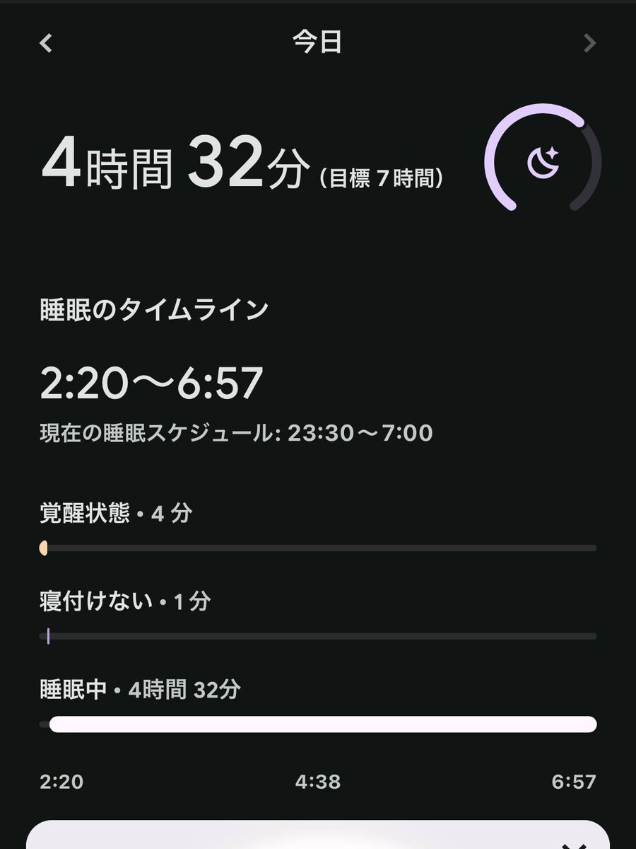 ゆうべの睡眠記録 22:20あたり就寝 ほとんどぐっすり眠れた。 そして、2:25起床 睡眠時間4時間5分 #睡眠記録