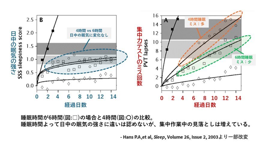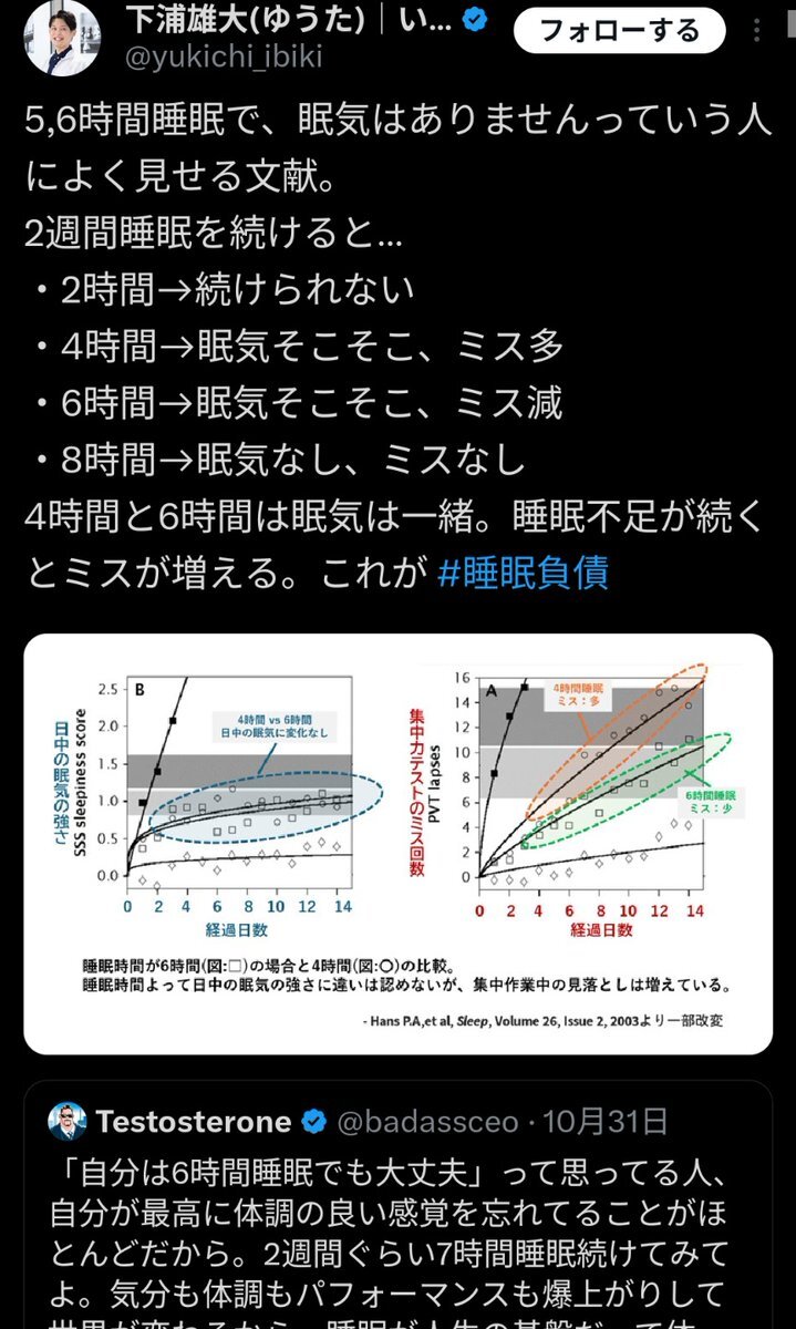 5,6時間睡眠で、眠気はありませんっていう人によく見せる文献。 2週間睡眠を続けると… ・2時間→続けられない ・4時間→眠気そこそこ、ミス多 ・6時間→眠気そこそこ、ミス減 ・8時間→眠気なし、ミスなし 4時間と6時間は眠気は一緒。睡眠不足が続くとミスが増える。これが #睡眠負債 pic.x.com/PN4BbYE1K6 x.com/badassceo/stat…