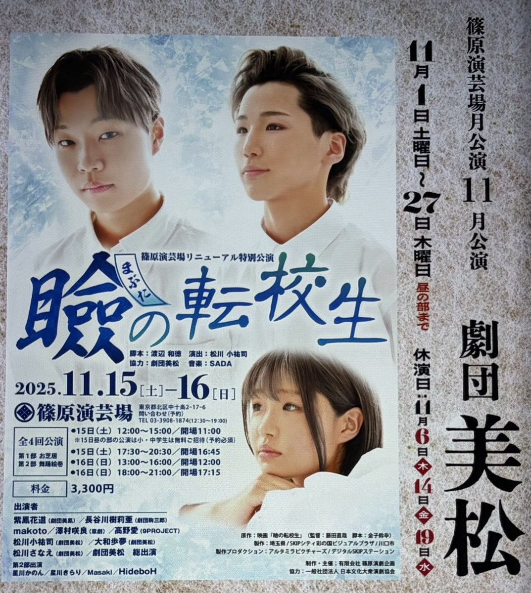 まだ #紅散鬼 のオーディション情報も #劇団美松 さんの存在すら知る前に、ユーロスペースで気になって観に行った映画『#瞼の転校生』。当時すごく辛い事があった時期で、この物語が僕の背中を押してくれました。 映像と違って物理的な制約があるなか、敢えて「演劇」でやる魅せ方ができてて良かった。 pic.x.com/SA4MIvYpaJ