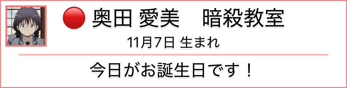 ••━━━━━━━ 🎀HAPPY BIRTHDAY🎀 ━━━━━━━━•• 本日11/7はE組が誇る“マッドサイエンティスト” #奥田愛美 の誕生日🎉🎂 奥田さんお誕生日おめでとう❗️ 奥田さんをみんなでお祝いをしましょう✨ #暗殺教室 #暗殺教室10th #奥田誕生祭 #OKUDAbirthday