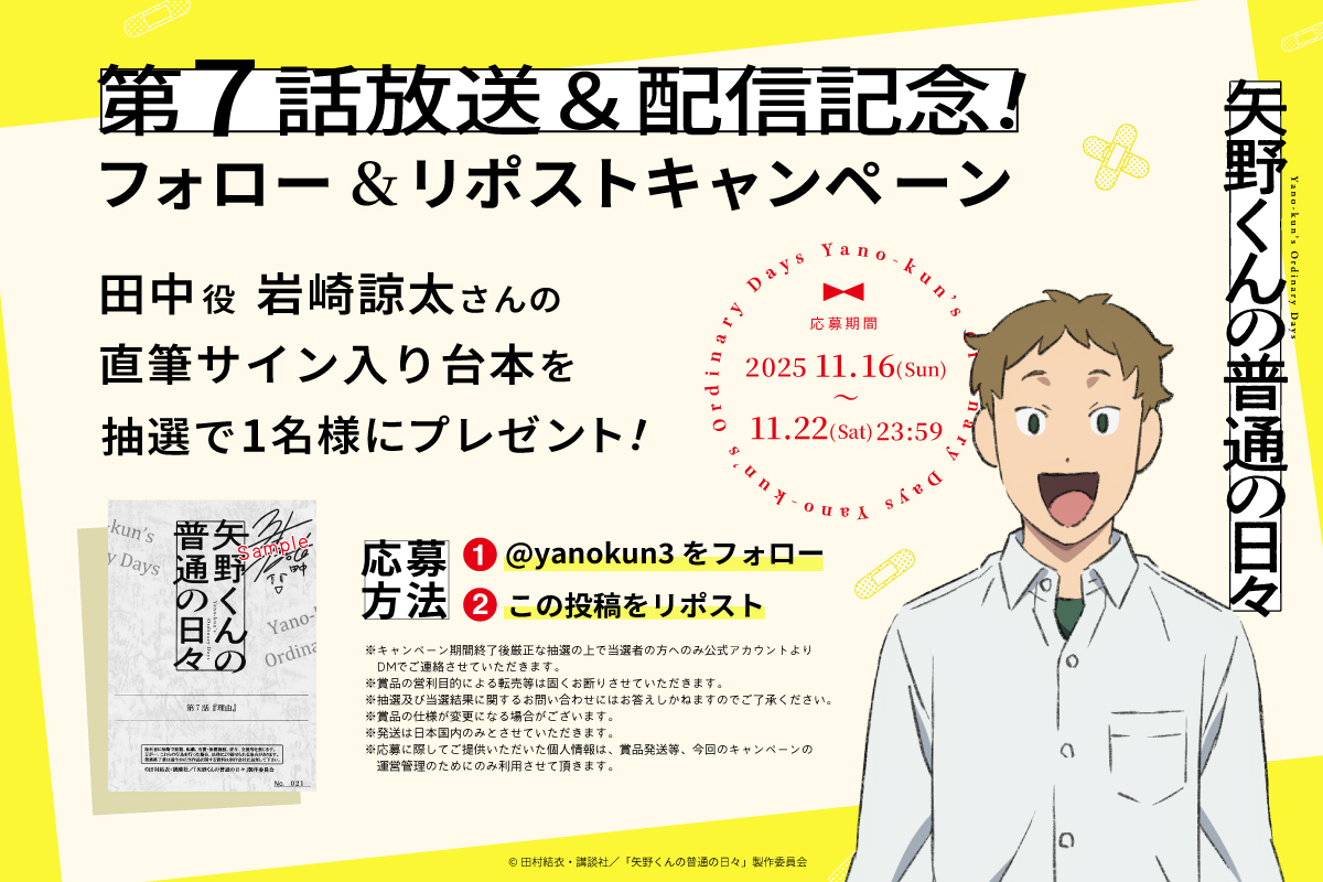 TVアニメ『矢野くんの普通の日々』❤️🩹 ₊⚪︎第7⃣話放送&配信記念⚪︎₊ プレゼントキャンペーン開催🎊 田中役 #岩崎諒太 さんの 直筆サイン入り台本を 抽選で1名様にプレゼント! ⠀ 1⃣@yanokun3 をフォロー 2⃣この投稿をリポスト 締切 11/22(土) #矢野くんの普通の日々 pic.x.com/oyTf8mnYcl