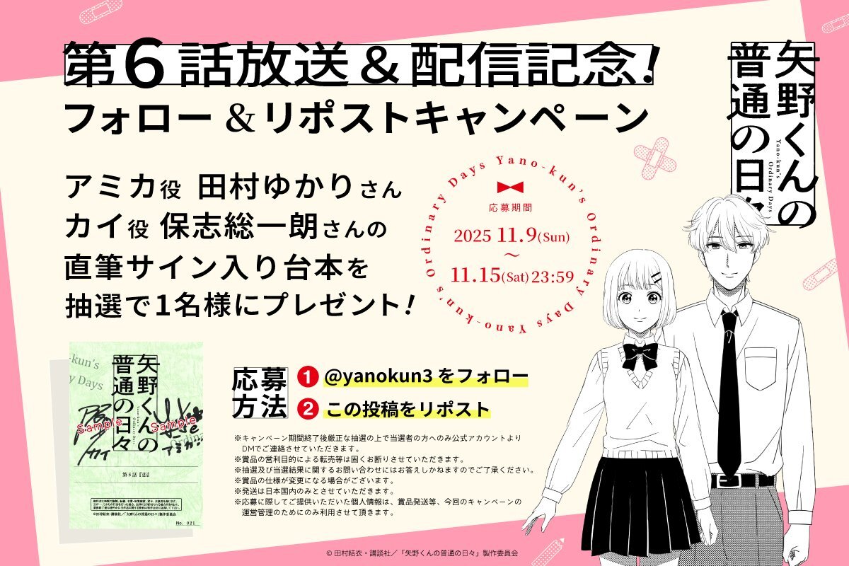 TVアニメ『矢野くんの普通の日々』❤️🩹 ₊⚪︎第6⃣話放送&配信記念⚪︎₊ プレゼントキャンペーン開催🎊 アミカ役 #田村ゆかり さん カイ役 #保志総一朗 さんの 直筆サイン入り台本を 抽選で1名様にプレゼント! ⠀ 1⃣@yanokun3 をフォロー 2⃣この投稿をリポスト 締切 11/22(土) #矢野くんの普通の日々
