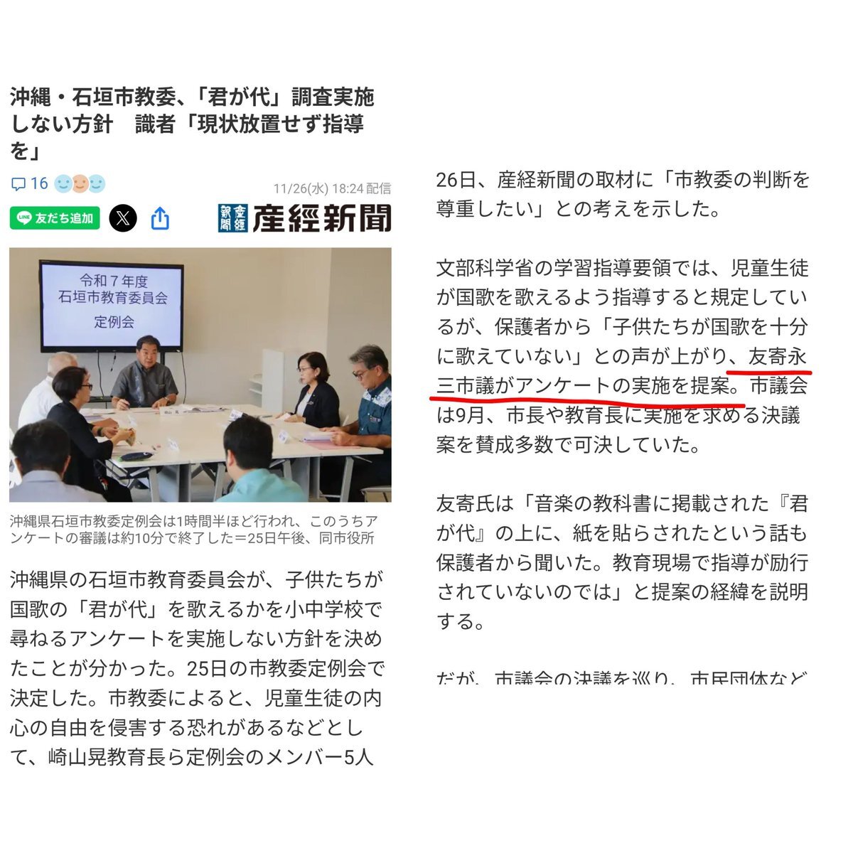 「教育の政治的中立性を踏まえた判断」 は石垣市教委の委員の方々のすぐれた見識と言える 「教育の政治的中立性」 は 「政治権力が教育に踏み込んではいけない」 ということ この石垣市議会の決議は「不当な支配」(教育基本法16条)にあたる #君が代 #石垣市 #アンケート news.infoseek.co.jp/article/jiji_2…