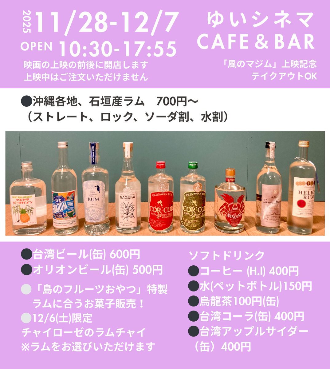 【ゆいシネマCAFE&BAR開店】 11/28-12/7 『風のマジム』上映記念! コルコル や石垣産のラムを片手に映画をお楽しみください🥃 もぎり・上映・カフェ全部ひとりでやっているのでお待たせしてしまうこともあるかもしれませんが、どうぞよろしくお願いいたします。 x.com/yuicinema/stat…