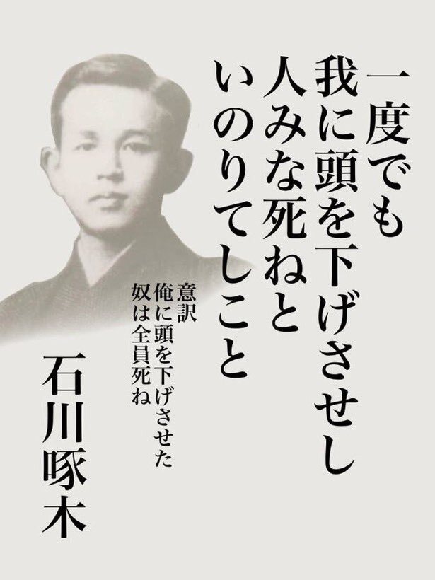 #石川啄木 カイジに出てくる債務者の代表みたいな、プライドの塊だった石川啄木が吐いた歌🙄 俺に金を貸したやつが悪い!なんで俺が頭を下げないとダメなんだ! と逆ギレしてる歌🫠🫠 個人的に給付額が少ないって文句を言う生ぽはコレに近い印象🫨🫨 pic.x.com/RyzqNCrGUz