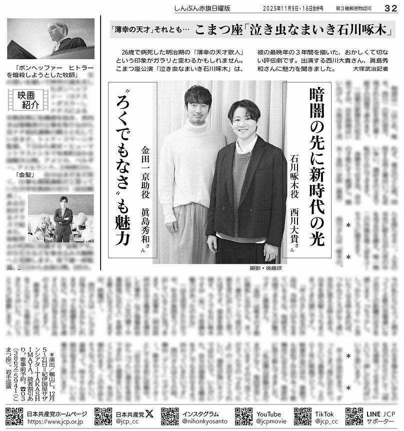#赤旗日曜版 #11月16日合併号 「薄幸の天才」それとも… こまつ座「#泣き虫なまいき石川啄木」 暗闇の先に新時代の光 #石川啄木 役 #西川大貴 さん “ろくでもなさ”も魅力 #金田一京助 役 #眞島秀和 さん pic.x.com/tEOjcbgSvL
