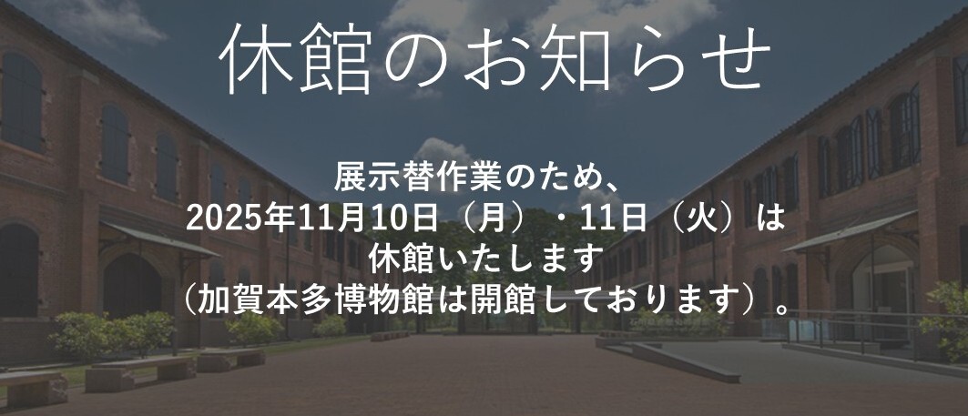 【休館日のお知らせ】 秋季特別展「#花開く九谷 ー19世紀加賀藩のやきもの生産ブームー 」は11月9日(日)をもって閉幕いたしました。ご来館誠にありがとうございました。 本日11月10日(月)、明日11日(火)は展示替作業のため休館いたします。 #石川県立歴史博物館 pic.x.com/fRxqHImU7X