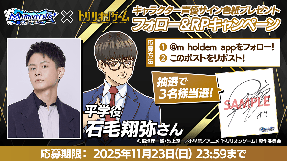 ♠️♥️#エムホールデム × #トリリオンゲーム ♦️♣️ コラボ開催キャンペーン! 平学役 石毛翔弥さんのサイン色紙を3名様にプレゼント♪ 💰応募方法💰 1:@m_holdem_appをフォロー ! 2:このポストをリポスト! 💡応募規約(必ずお読みください)💡 mpj-portal.jp/game/news/camp…