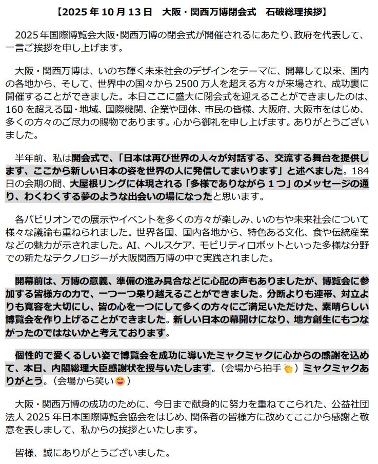 返信先:@shigeruishiba石破総理、各国の首脳をはじめ多くの来訪者・関係者の皆様、そして何といってもミャクミャクくん、万博を盛り上げて頂いてありがとうございました🥰👏✨ #石破総理ありがとう #万博閉会式 👇閉会式での石破総理のご挨拶です☺️ youtube.com/live/qHbE4x7OR… pic.x.com/K74IGDRwCx