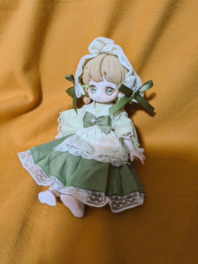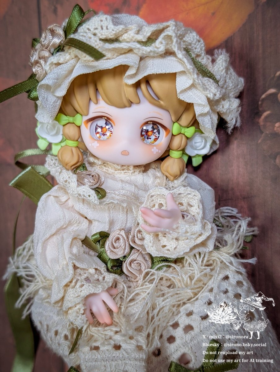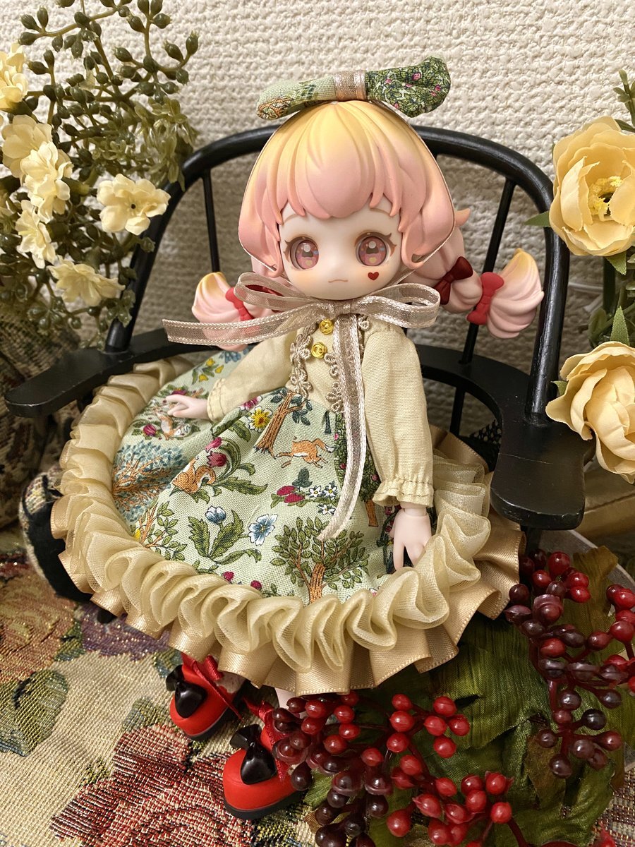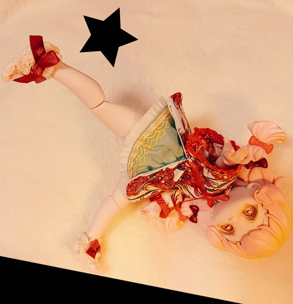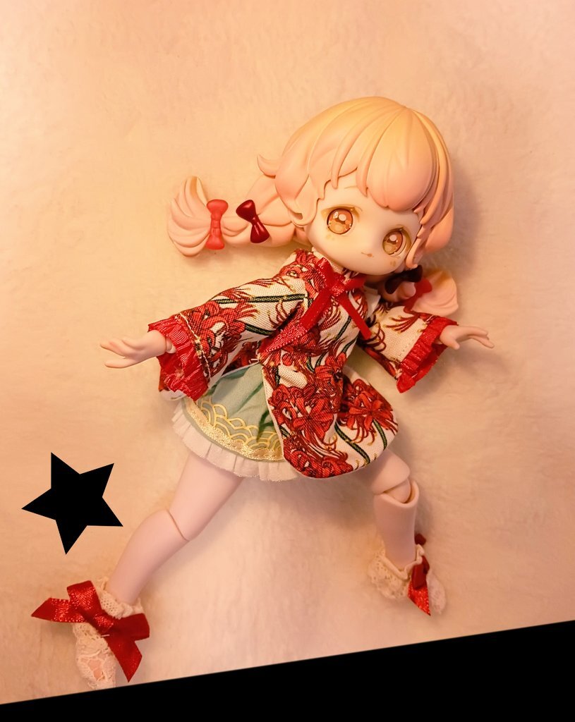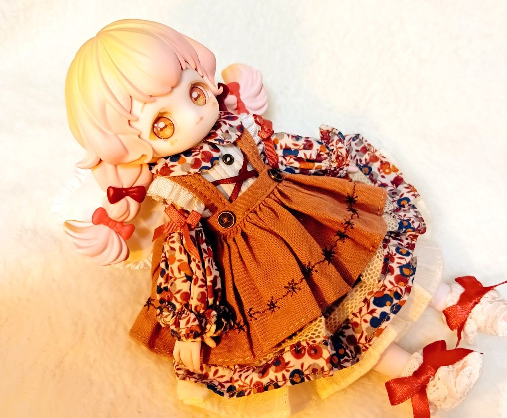 お色味が似てるので月飛び時間ちゃんのお洋服着てもらいました。 前身頃がちゃんと止まらないけど、エプロンドレスなのでなんとか着られましたよ🍀 和風も可愛いね。 #砕星軌跡 pic.x.com/0hXD2Gi6aP
