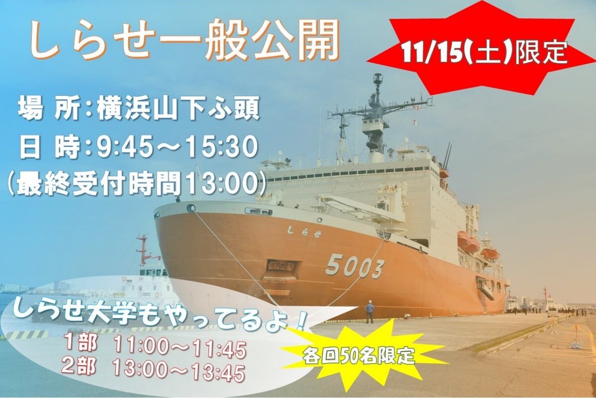 【11/15(土)限定企画】砕氷艦「しらせ」一般公開🚢 時間:9:45〜15:30(最終受付時間13:00!!) 場所:横浜山下ふ頭 最寄り駅:元町・中華街駅徒歩10分 近隣に大型駐車場がないため公共交通機関のご利用をお願いします。 ご来場をお待ちしております!🐧 #海上自衛隊 #しらせ