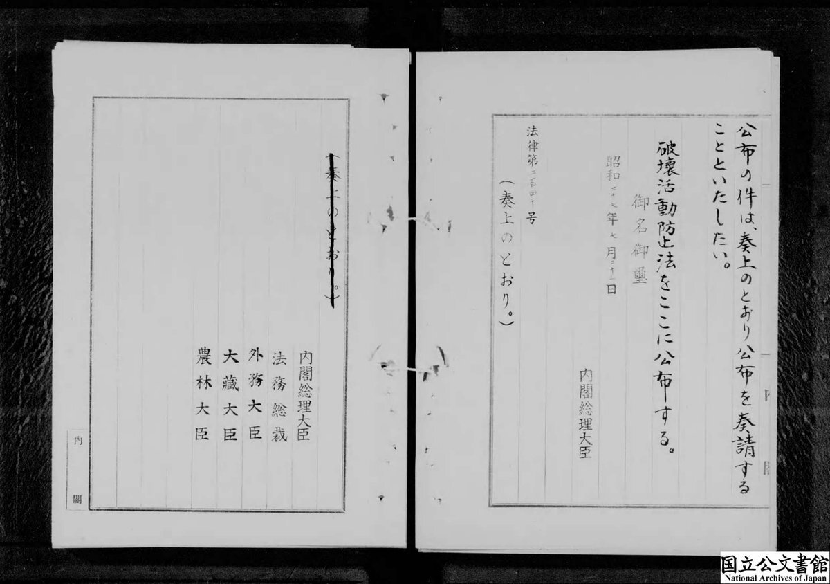 1952年の今日(7/21)は、#破壊活動防止法 が公布された日です。破壊活動防止法は、「暴力主義的破壊活動を行った団体に対する必要な規制措置」を定めたものです。同日、#公安調査庁 も設置されました。資料は、同法律の公布に関するものとなります。 jacar.archives.go.jp/das/meta/A2110… pic.x.com/4CDFweMlzG